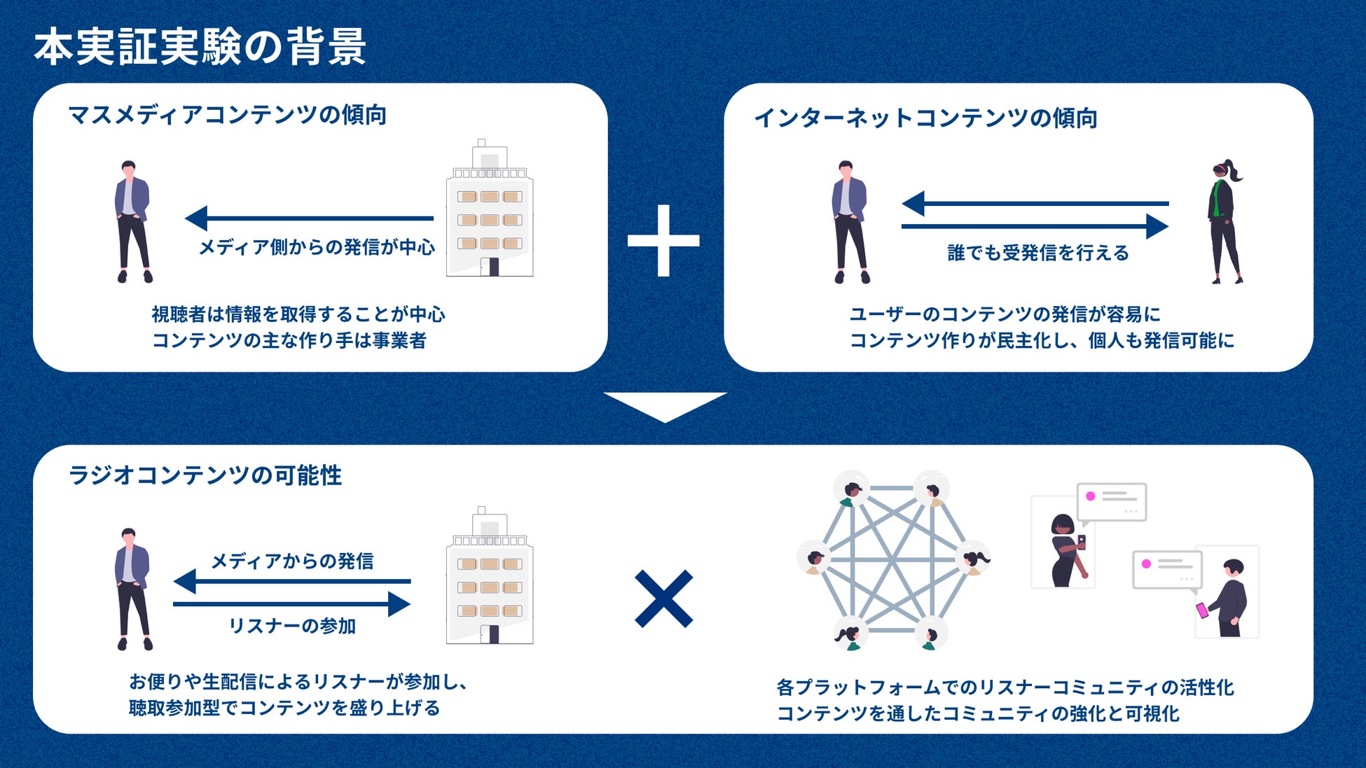 本実証実験は、音声コンテンツを取り巻くリスナーコミュニティの活性化を目的として、リスナーのコンテンツに対する愛着の向上や継続的な関係構築をブロックチェーン技術を活用して目指す取り組みです。