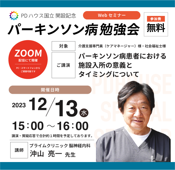 今回は、プライムクリニック 脳神経内科 沖山 亮一 先生をお迎えし、「パーキンソン病患者における施設入所の意義とタイミングについて」と題して、介護支援専門員(ケアマネージャー)と社会福祉士を対象としたパーキンソン病に関するオンライン(ZOOM配信)勉強会となります。