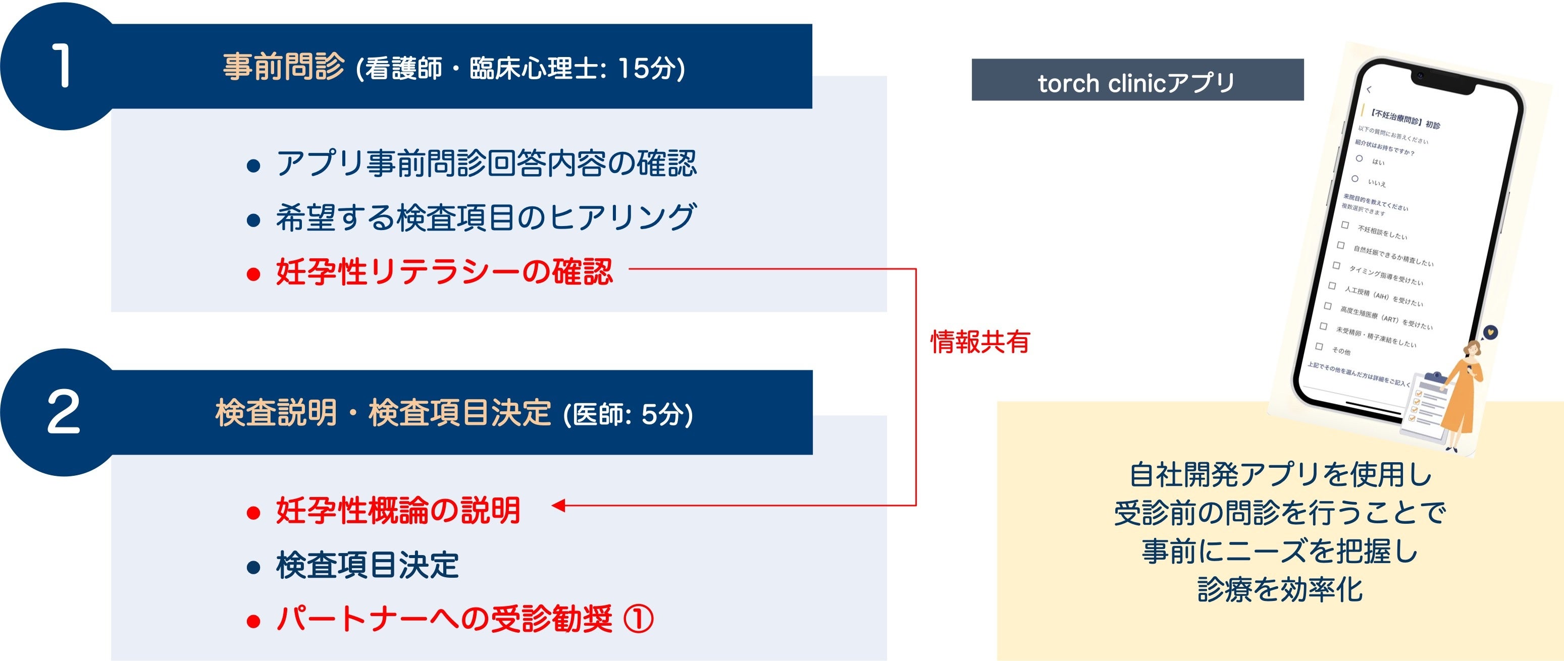 当院のプレコンセプションケアの詳細です。まず、受診前に専用アプリを用いた事前問診を行います。ここでは妊娠歴や既往歴など一般的な内容だけでなく、直接の対話で答えにくい性交渉の頻度や、また家族計画の要となる挙児希望の数や思いなども問診します。来院後の対面問診では、アプリ事前問診の内容を参考にしつつ、妊娠の仕組みについてなどの妊孕性知識も確認します。情報を担当医へ共有し、医師より各受診者の背景やニーズに合わせた説明を行い、検査項目を決定します。単独で御受診された場合は、希望や必要に応じてパートナーの受診も勧奨します。