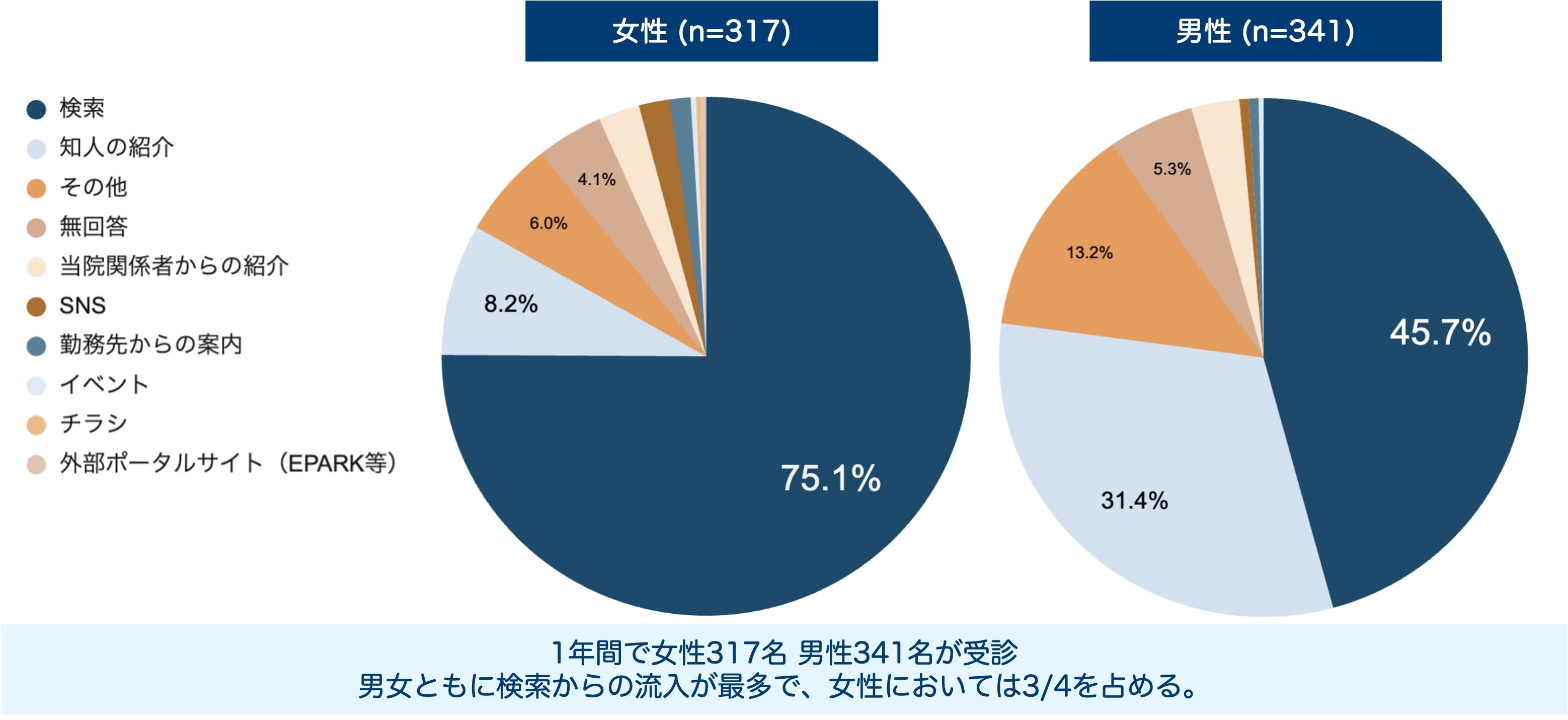 これらの施策を実施し、開院より1年で当院のプレコンセプションケア外来を受診した方は、女性317名、男性341名でした。特に女性において検索からの流入が大半を占めています。