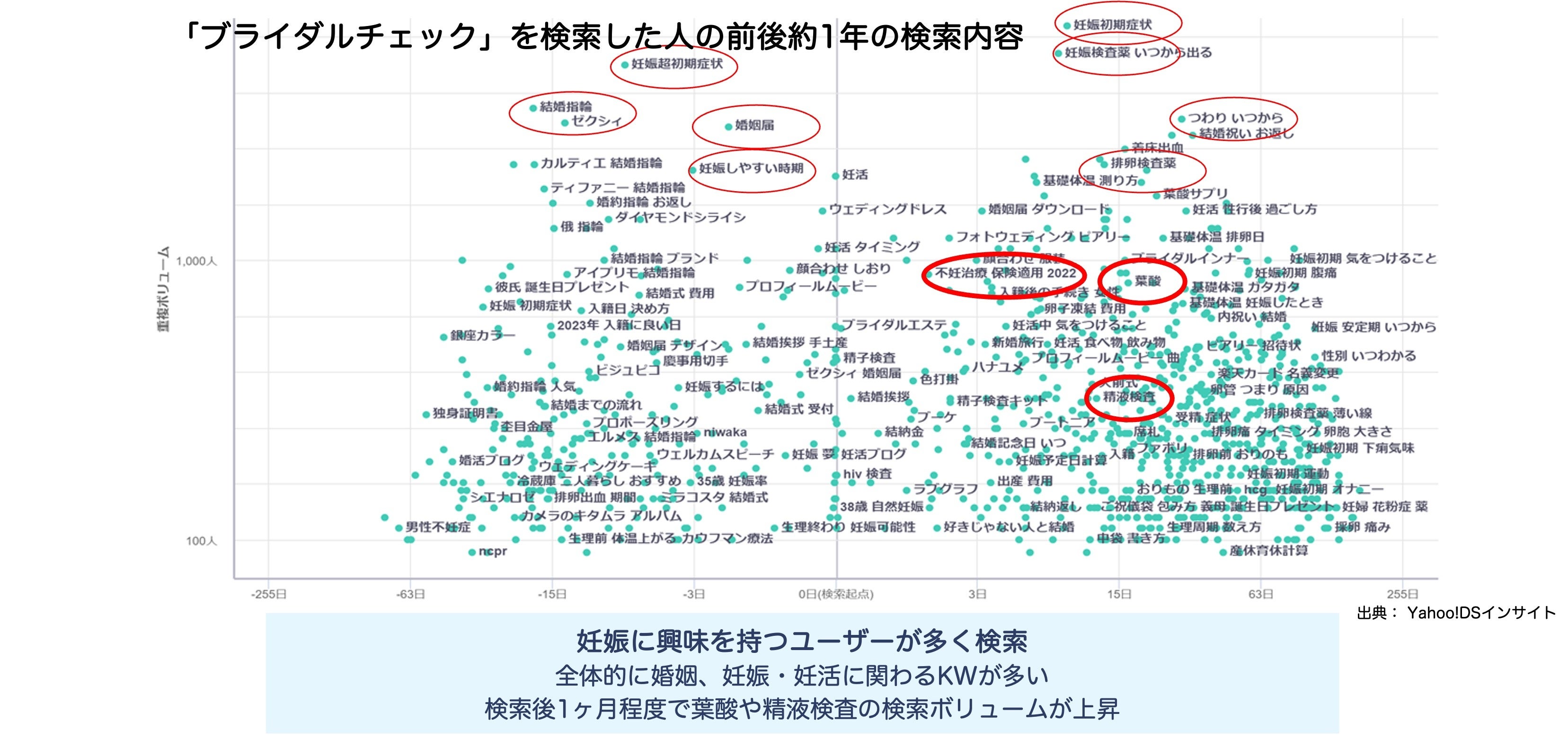 また「ブライダルチェック」を検索したユーザーの前後1年の検索ワードは、婚姻や妊娠初期に関わるキーワード、「葉酸」や「精液検査」など、より妊娠や出産を意識した検索動態をしているユーザーが多いと推測されます。