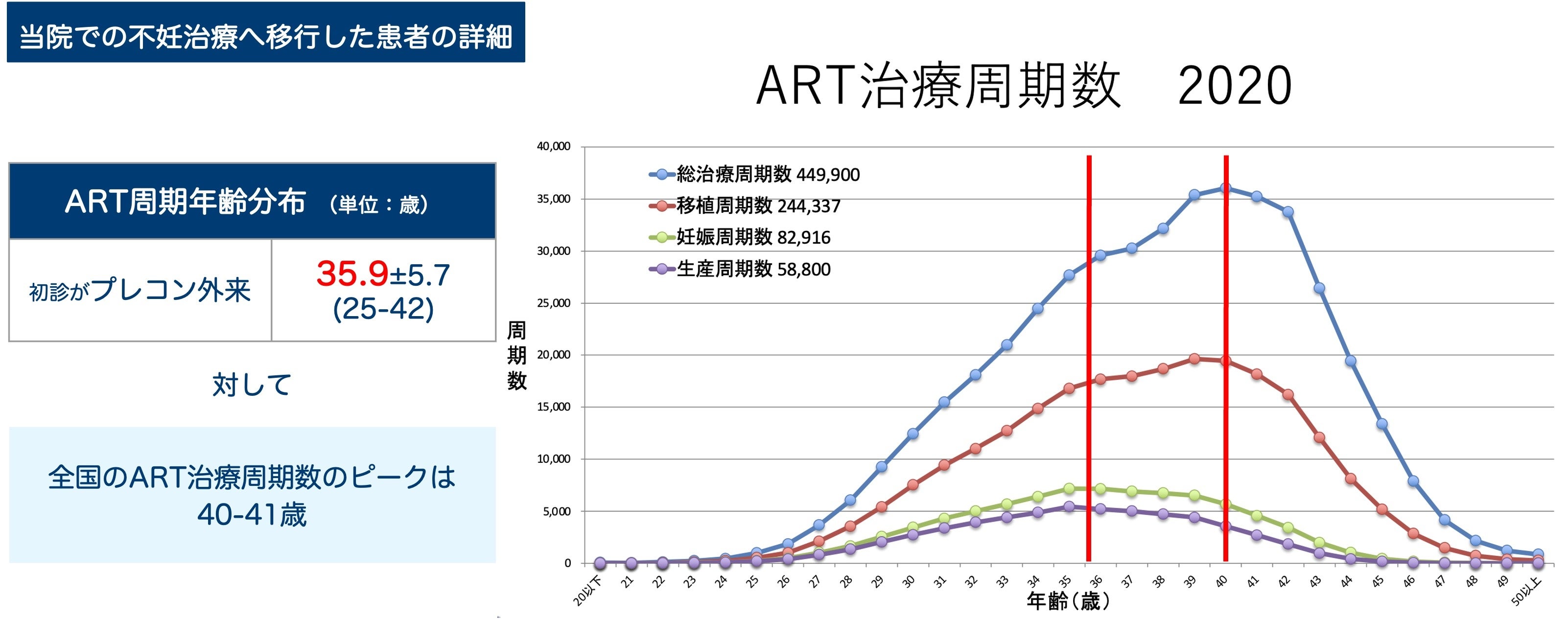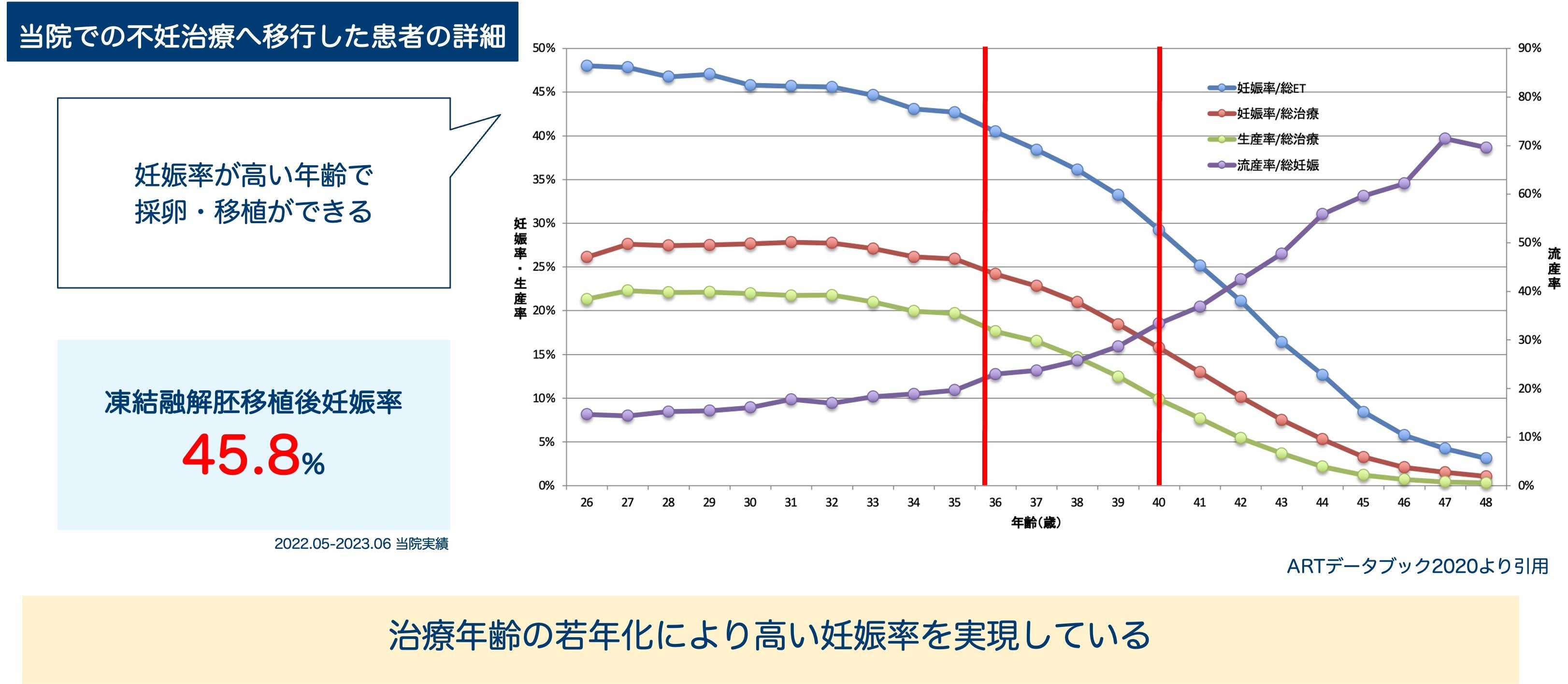 ARTへ移行した患者の平均年齢は35.9±5.7歳と、全国のART周期のボリュームゾーンである40~41歳に比べて若年で、胚移植による妊娠率は約46%と高い結果となりました。