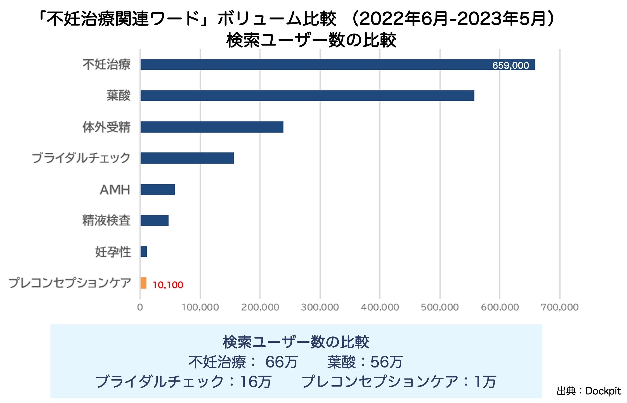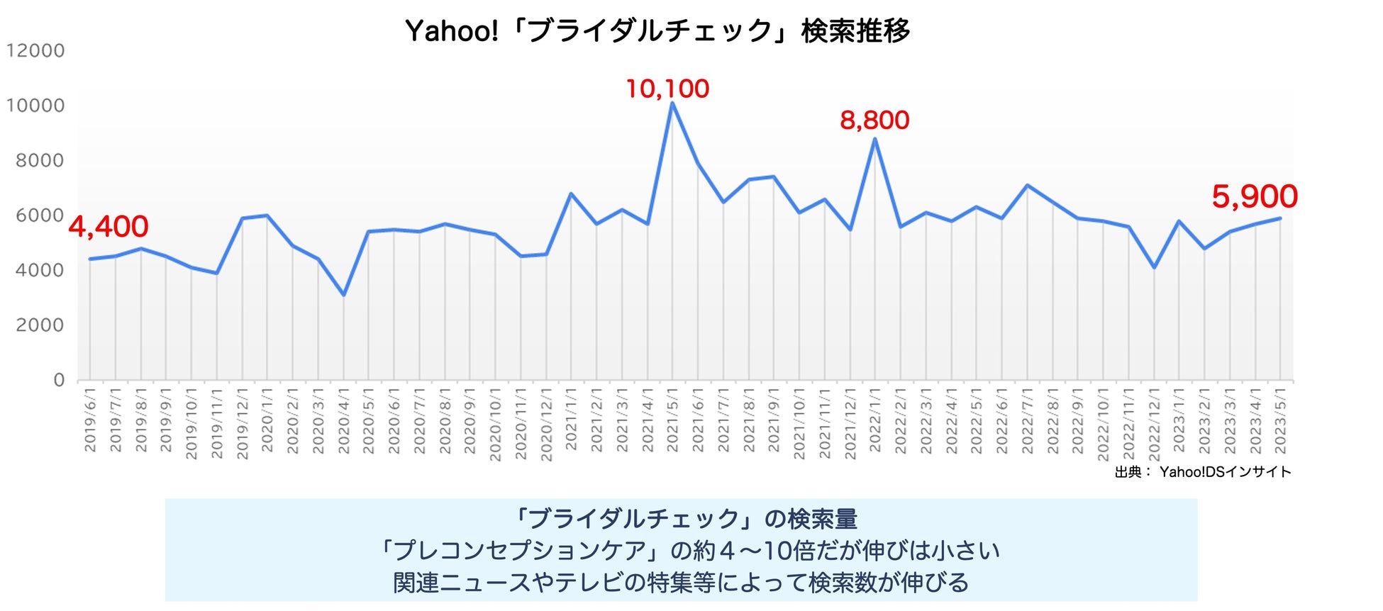 一方「ブライダルチェック」の月間検索量は 「プレコンセプションケア」の約4~10倍高く、検索ユーザー数も16万人と顕著に差を認めております。