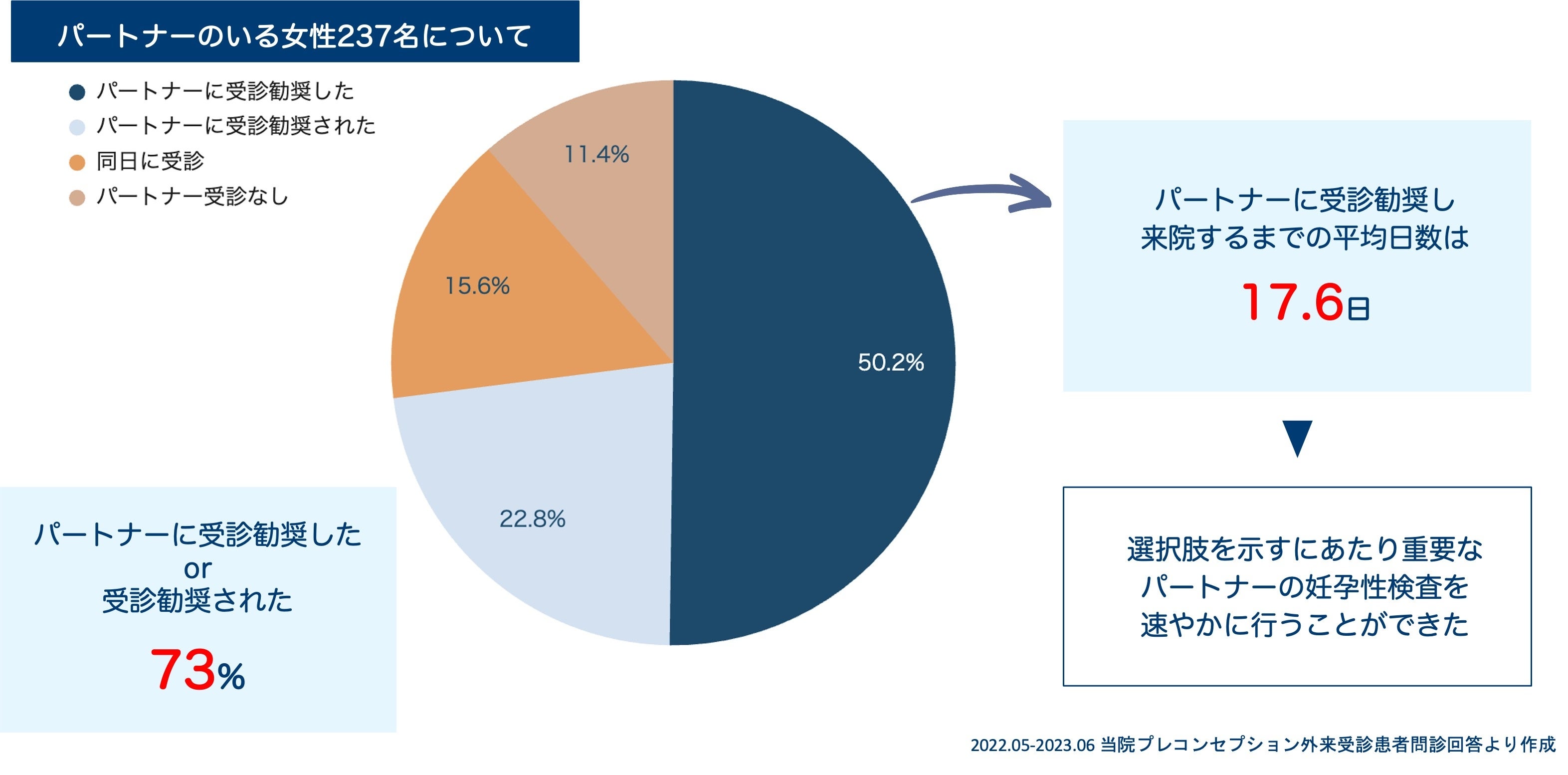 プレコンセプションケア外来を受診された女性314名のうちパートナーを有する方は237名でした。そのうち同日にパートナーと受診した方は16%でしたが、自身の受診後にパートナーにプレコンセプションケア外来を勧めて実際にパートナーが受診した方は50%、先に受診を終えた男性パートナーに受診を勧められて受診した方が23%と、ナッジ効かせカップル揃った受診を促せていることが分かります。また受診勧奨を受けた男性パートナーは女性の受診後平均17.6日で当院を初診しており、速やかに妊孕性検査の重要性を共有し意思決定が出来ていると考えます。