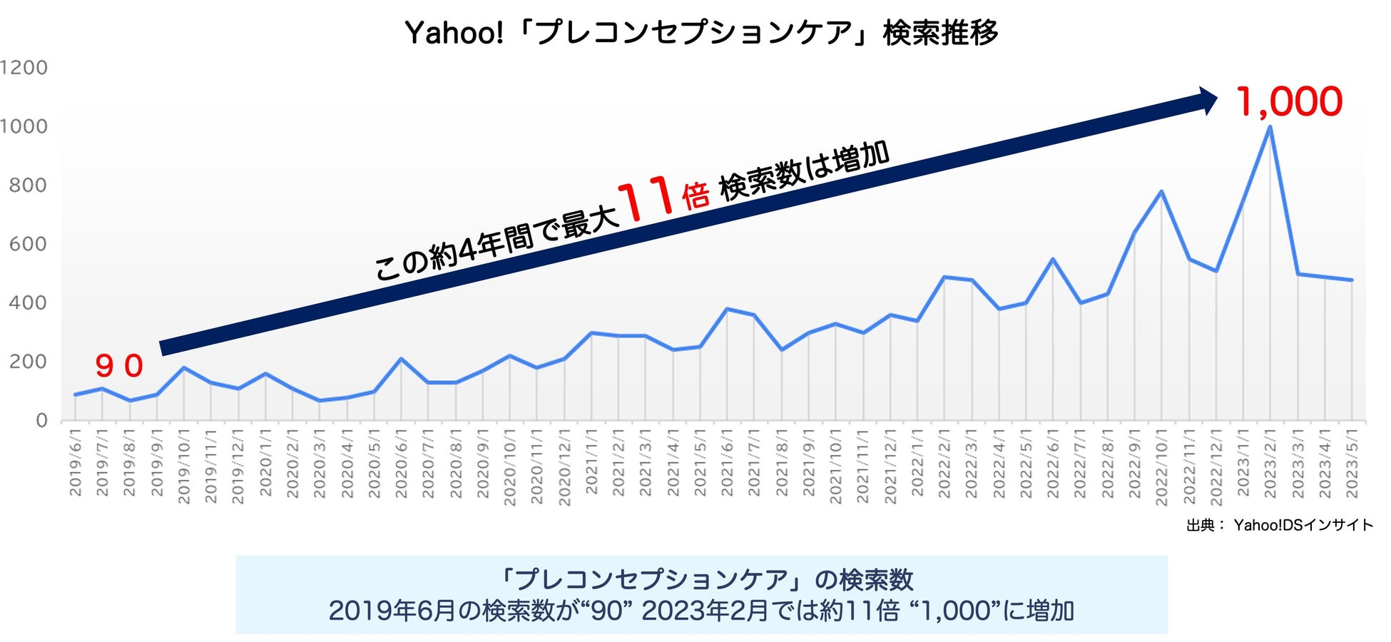 プレコンセプションケアをフックとした妊孕性の教育を実施するには、まず「プレコンセプションケア」を認知してもらう必要があります。プレコンセプションケアという言葉の認知度を調査するために、Yahoo!DSインサイトを用いて、2019年6月から2023年5月までの4年間における「プレコンセプションケア」の検索数を調査しました。検索数は徐々に増加し、現在では500-1000回/月程度まで増加しているものの、直近1年間における検索ユーザー数は僅か1万人でした。