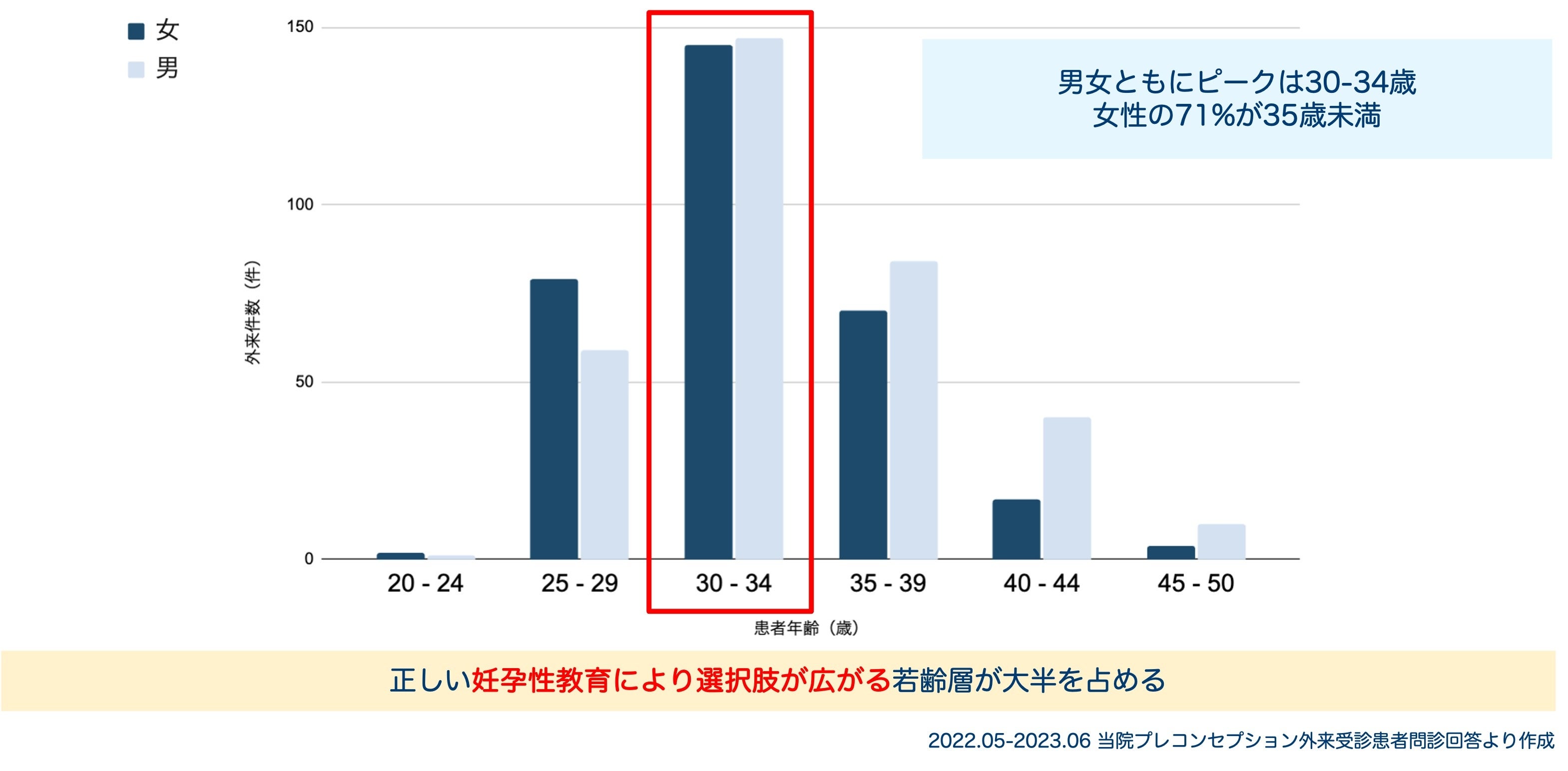 プレコンセプションケア外来を受診した約650名の内訳は、クリニック近隣の品川区、目黒区、渋谷区居住の方が最も多いですが、女性が遠方に居住の男性パートナーに受診勧奨を行い、カップルで来院するケースも散見されました。年齢は男女ともにピークが30〜34歳、女性の71%は35歳未満でした。早期に妊孕性に知ることは大変重要ですので、若齢層が大半を占めたことは適切な層にリーチ出来ていると考えます。