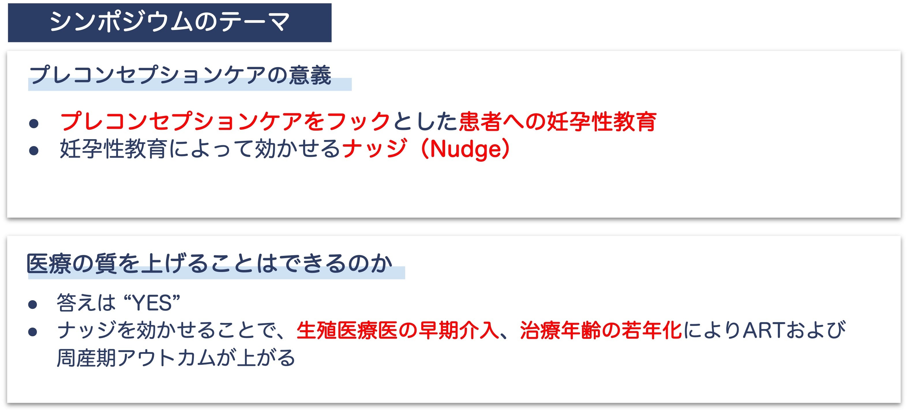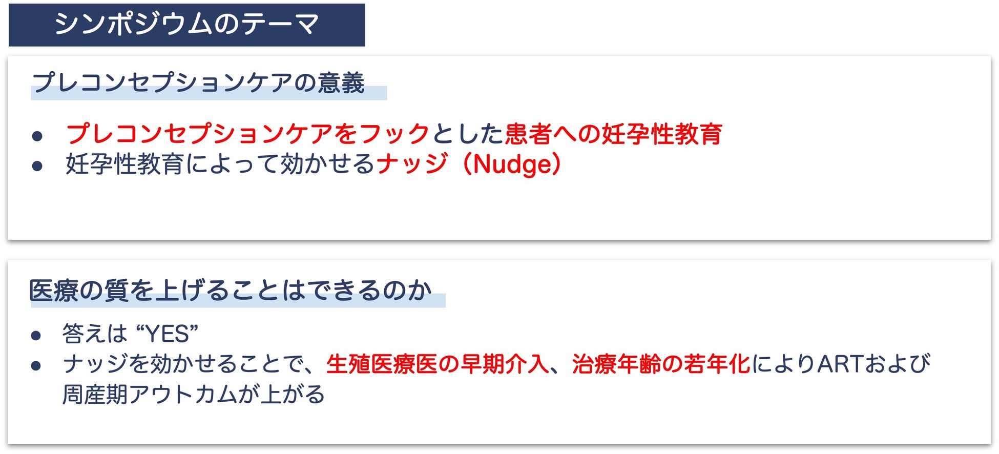 「プレコンセプションケア」とは、「妊娠の計画の有無に関わらず早期に妊娠や出産に関する知識を持ち、自分とそのパートナーの健康意識を高めること」です。「プレコンセプションケアの意義」及び「生殖医療の質を上げることはできるのか」を問う本シンポジウムにおいて、我々はこの意義を「ケアをフックとした患者への妊孕性教育」及び、医療行動経済学において、「肘で軽くつつく」と表現される「ナッジ(Nudge)」を効かせること、更に我々のような不妊治療専門施設において、「ナッジを効かせることで、受診者に対する適切な妊孕性教育を行い、治療年齢の若年化を通じて、生殖補助医療技術(ART : Assisted Reproductive Technology)の成績および周産期アウトカムが上がる」と考えました。