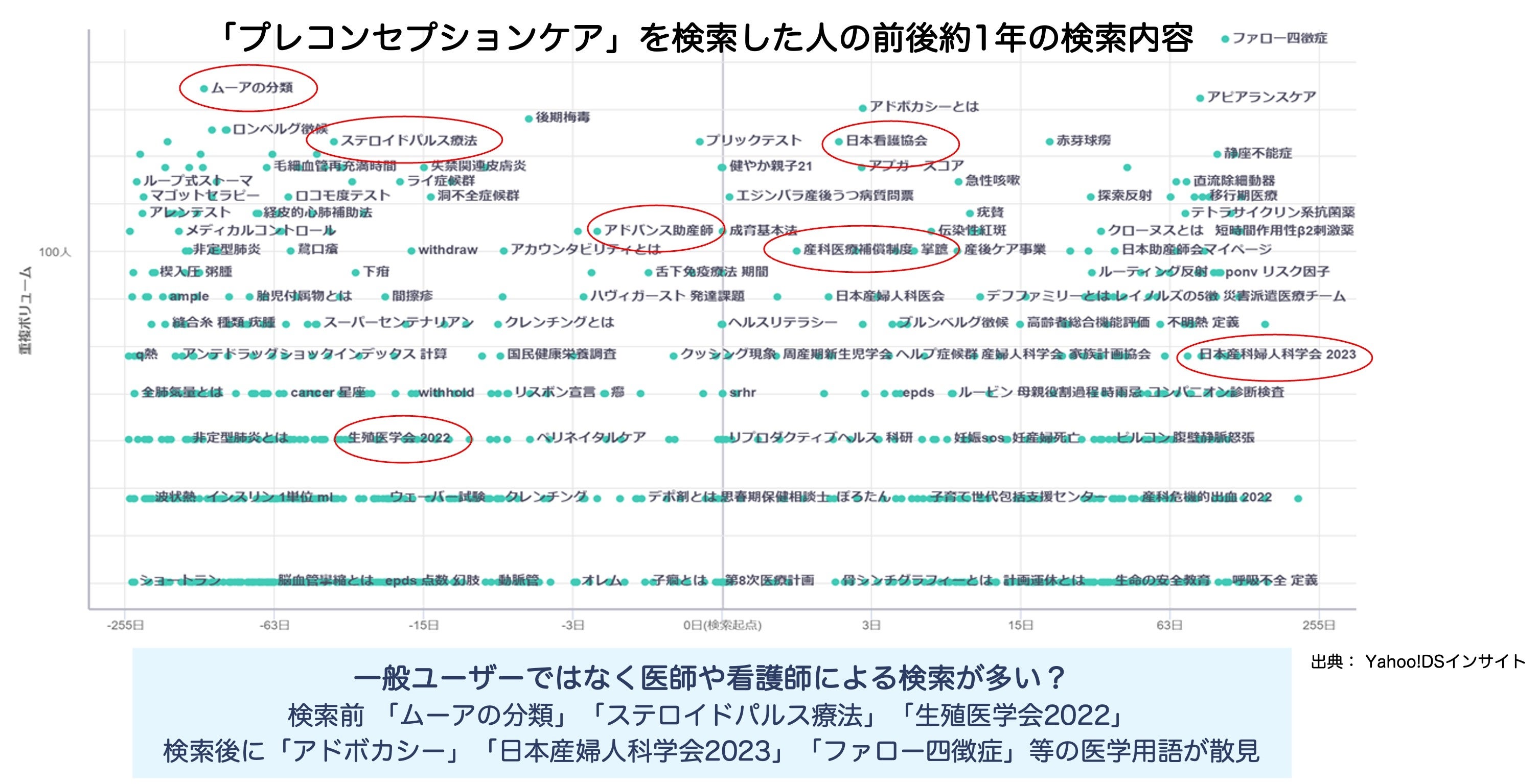 更に「プレコンセプションケア」を検索したユーザーの前後約1年の検索ワードを調査したところ、検索前後 には「ムーアの分類」「ステロイドパルス療法」「日本産婦人科学会2023」「ファロー四徴症」等の医学用語が多く散見され、検索したユーザーには医療者が多く含まれる可能性があります。