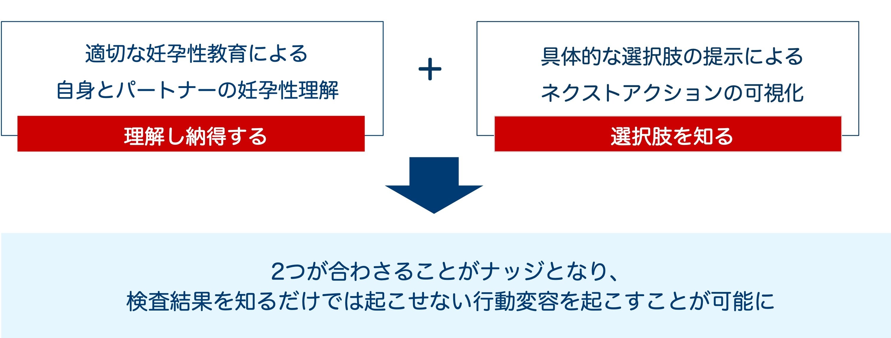 ナッジを効かせるプレコンセプションケア外来の肝は、この「適切な妊孕性教育による自身とパートナーの妊孕性理解」と「具体的な選択肢の提示によるネクストアクションの可視化」です。これら2つが合わさることでナッジとなり、ただ検査結果を知るだけでは起こせない行動変容を起こすことが可能と考えます。