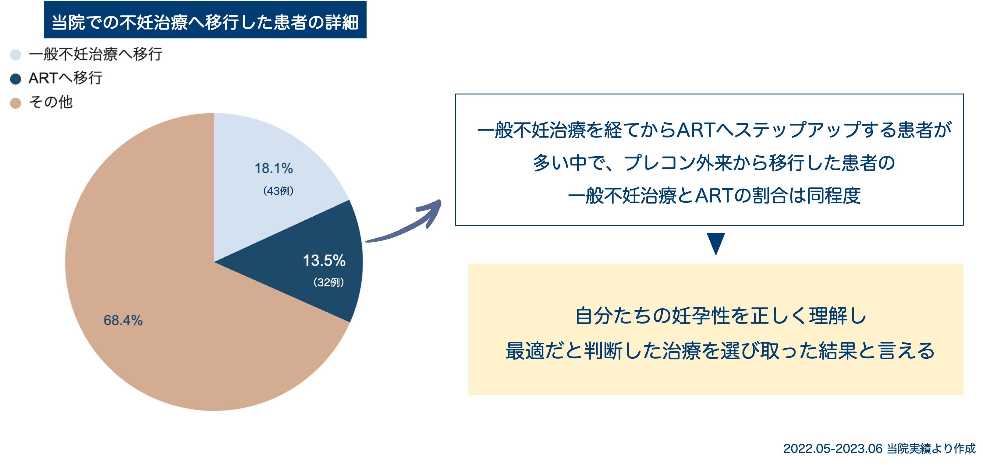 プレコンセプション外来から不妊外来を受診された患者は、タイミング法や人工授精といった一般不妊治療と、体外受精及び顕微授精をはじめとした高度生殖医療(ART)を受ける方が半々でした。不妊治療は一般不妊治療を経てからARTへステップアップすることが一般的です。しかしプレコンセプションケア外来で早期に適切な検査を実施することにより、卵巣機能不全や卵管閉塞、乏精子症などの疾患の発見、更にカップル揃って受ける妊孕性教育により議論や意思決定が促進されることで、最適と判断した治療を選ぶことができた結果と考えます。
