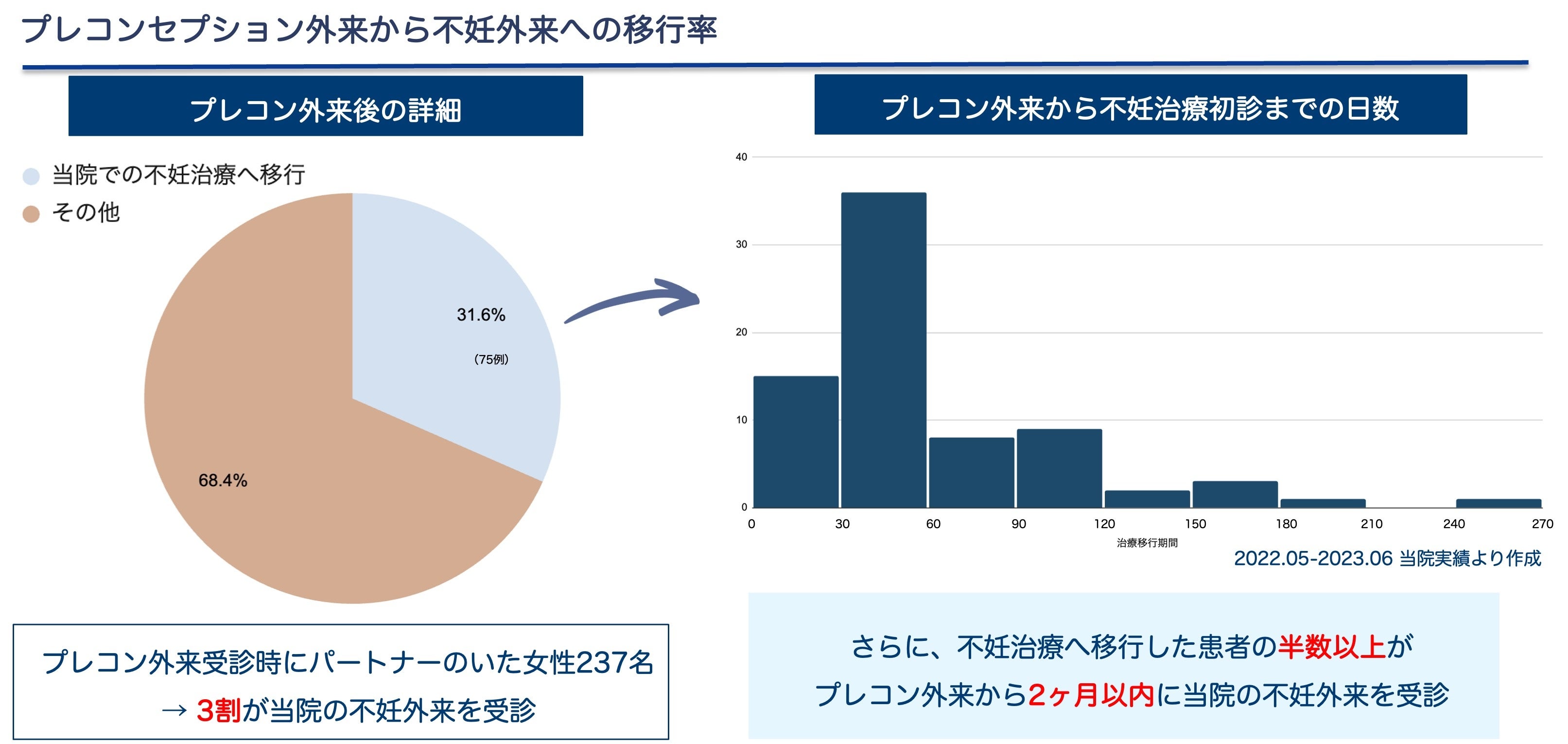 パートナーを有する女性237名のうち、3割が当院の不妊外来を初診しました。意思決定までのスピードは早く、半数以上の方はプレコンセプションケア外来から2ヶ月以内に受診されています。