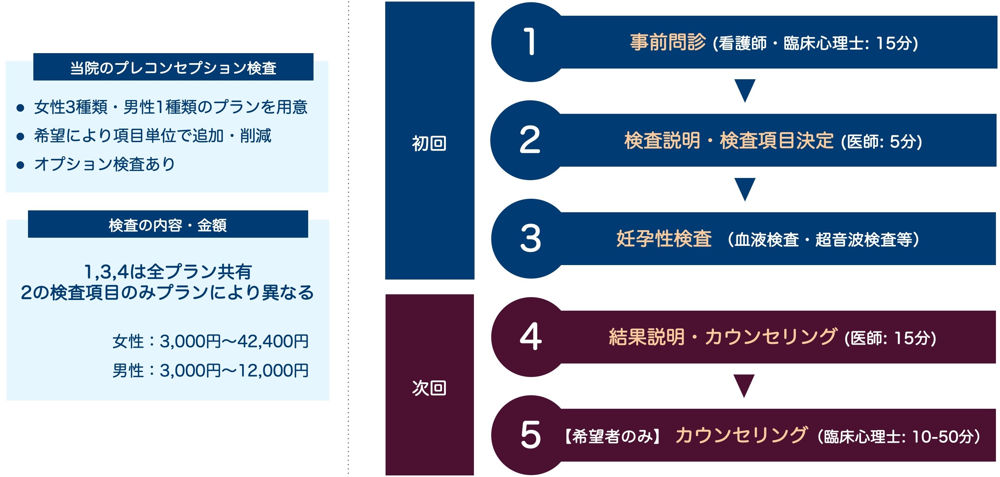 当院のプレコンセプションケア外来は、大きく「検査」と「結果説明」の2回の受診に分かれます。初診時の流れは、看護師や心理士からの事前問診(15分)、その後医師から各種検査プランの説明(5分)、検査(5〜10分)という流れです。初回受診の2週間前後で2回目の受診をしていただき、医師より結果の説明・妊孕性教育(15分)を行います。検査結果が芳しくない場合などは、カウンセリングを紹介するケースもあります。