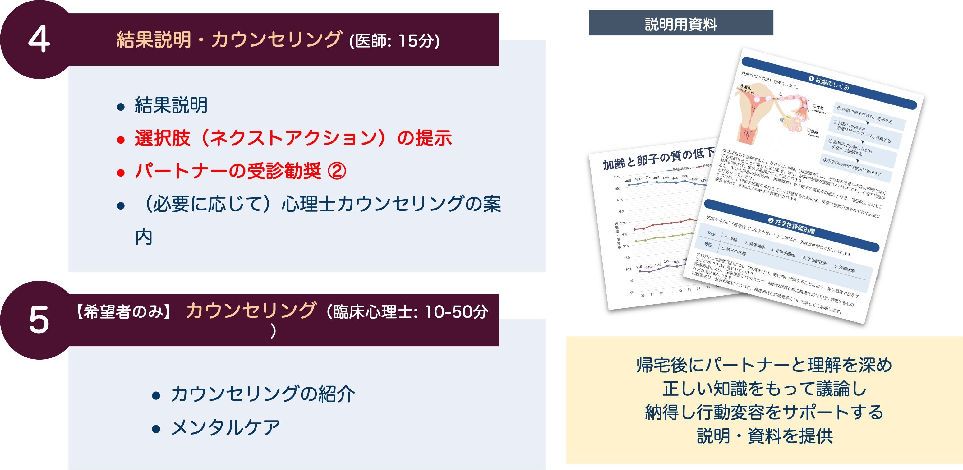 結果説明時の外来では、ただ内容を解説するだけでなく受診者の医学的・社会的背景を考慮した適切な選択肢(ネクストアクション)を提示しています。対面時に先行研究やガイドラインに準じて作成したスライドを用い説明を行い、場合によってはパートナーの受診勧奨(2回目)を行います。受診後にパートナーと共に妊孕性に関する理解を深め、家族計画についてディスカッションできるような資料をアプリ内に準備しています。