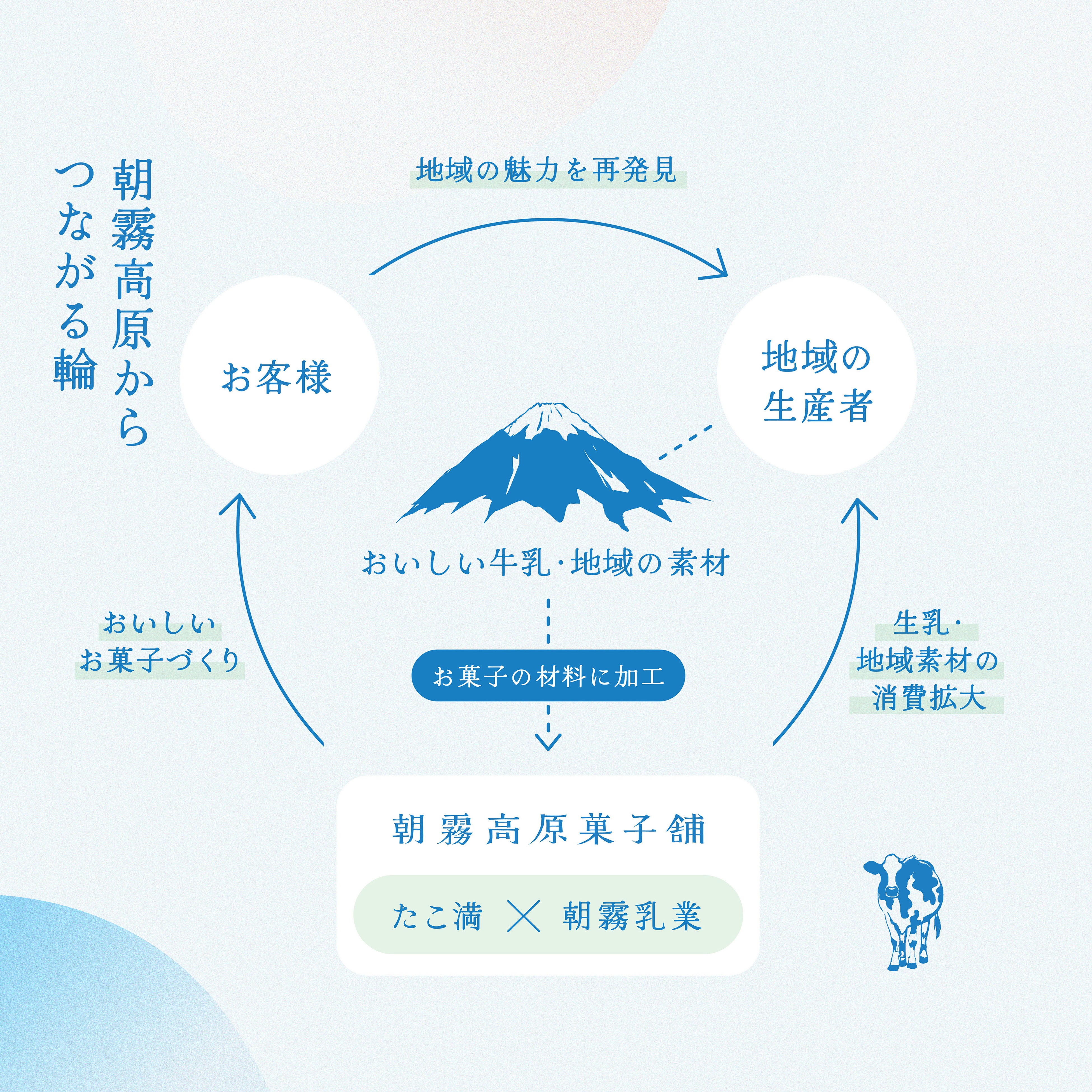 お菓子屋さんが乳業メーカーとタッグを組んだ一次産業直結スイーツブランド。富士山の麓、朝霧高原でとれた生乳をたっぷり使用、生乳を加工する上で出る副産物も使い、その美味しさを余すことなく活かしたお菓子を作り続けます。富士山や朝霧高原の自然をモチーフに、原材料・製法にこだわり一手間かけたお菓子を提供します。