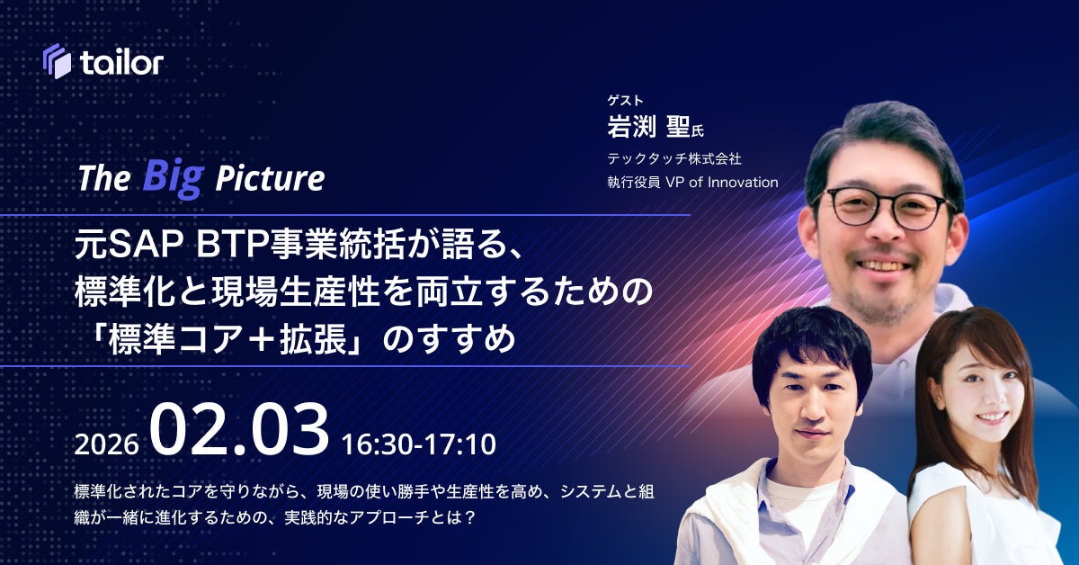 ヘッドレスERPプラットフォームを提供するTailor Technologies, Inc.(本社: 米国カリフォルニア州サンフランシスコ、代表:柴田陽)は、ウェビナーシリーズ「The Big Picture」第8回を、2026年2月3日に配信いたします。