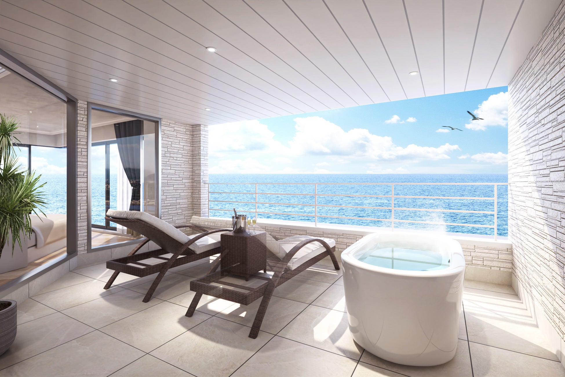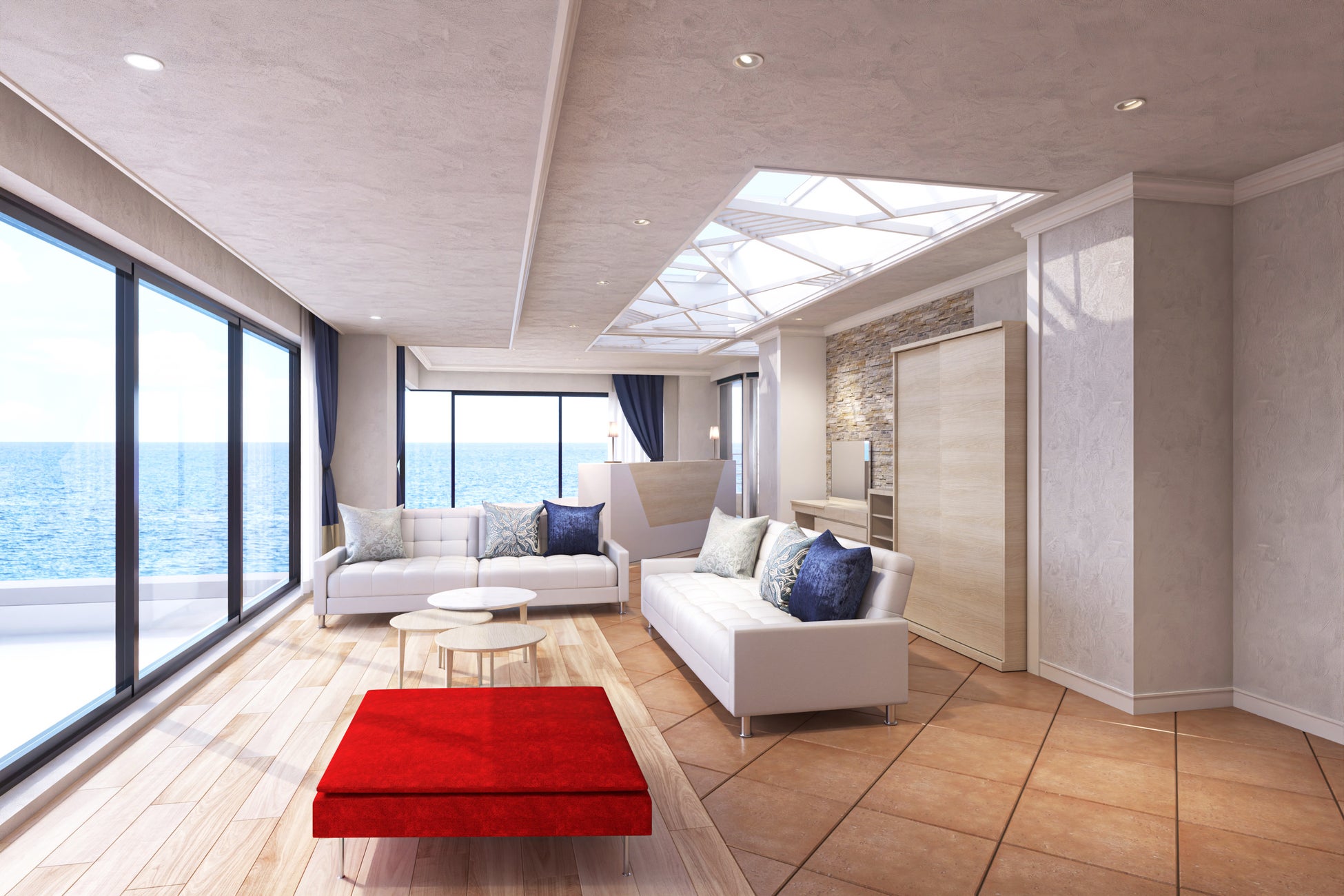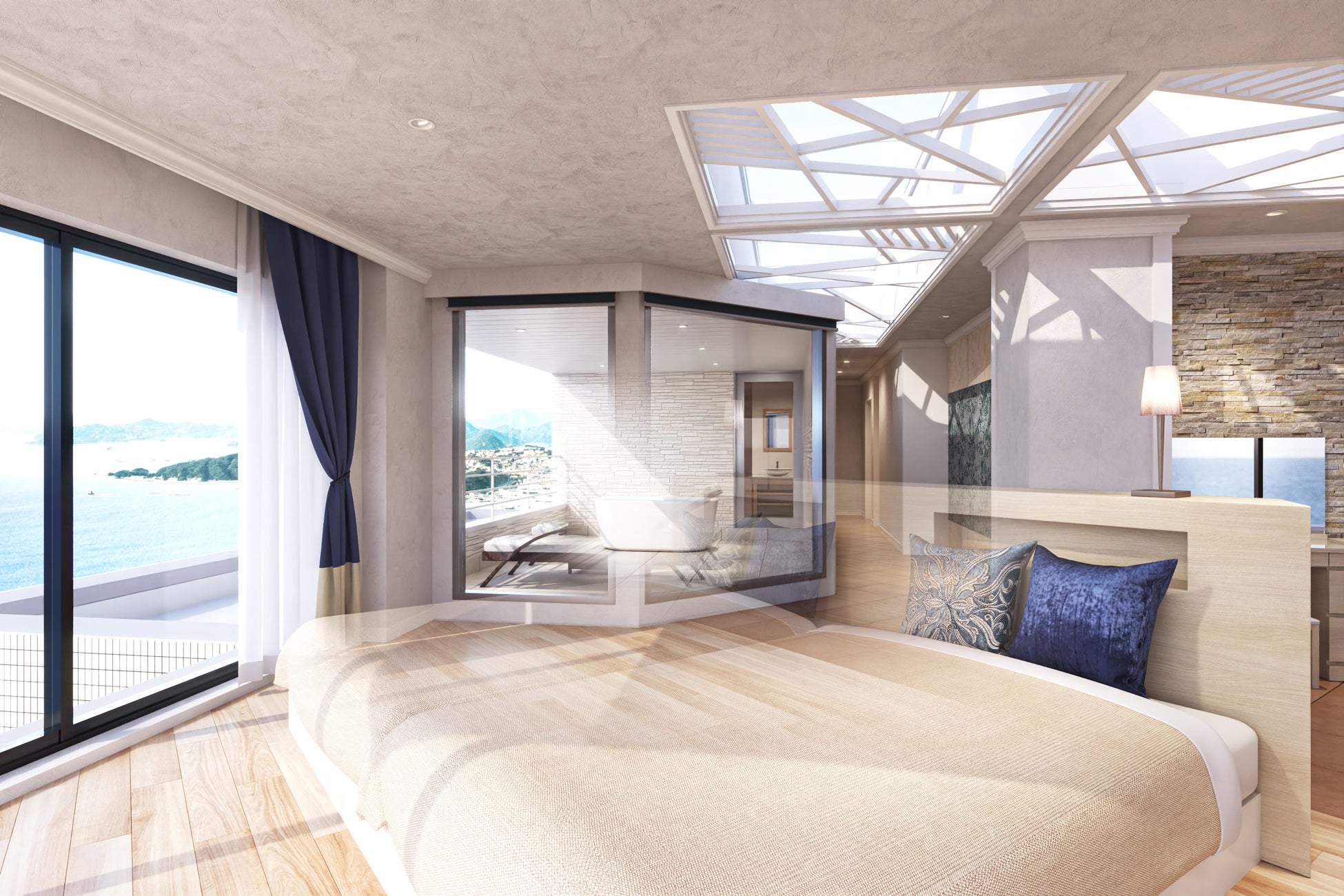 客室のリビングからはもちろん、露天風呂や岩盤浴からも地上100mの太平洋の絶景を堪能できる広さ116㎡のプライベートな空間は、お客様に極上のひとときを提供いたします。