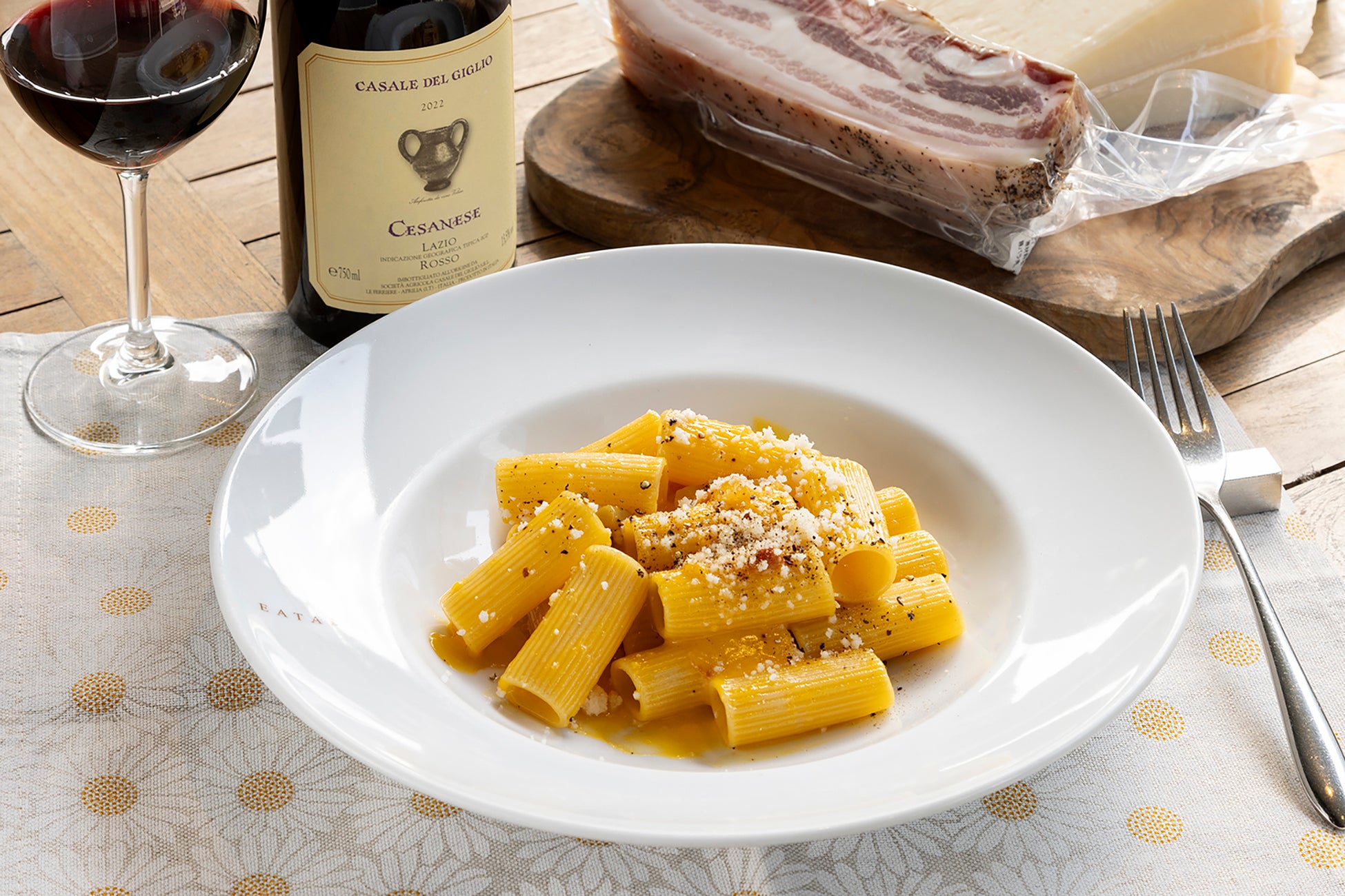 いつものカルボナーラを本場ローマ風にリガトーニで。