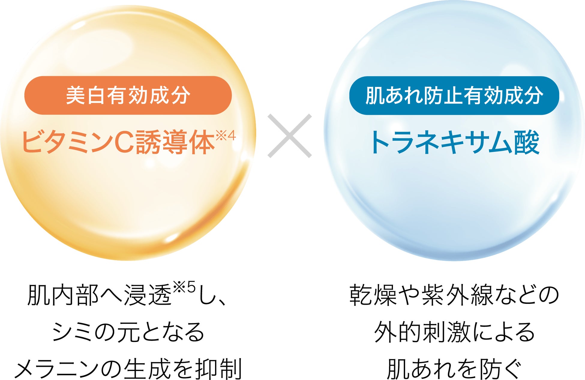 肌濁りの原因となる色素トラブルに立ち向かうため、シミ・そばかすを防ぐビタミンC誘導体(※4)と、肌あれを防ぐトラネキサム酸をW配合。内側(※2)からツヤにあふれた、明るくなめらかな肌へ導きます。