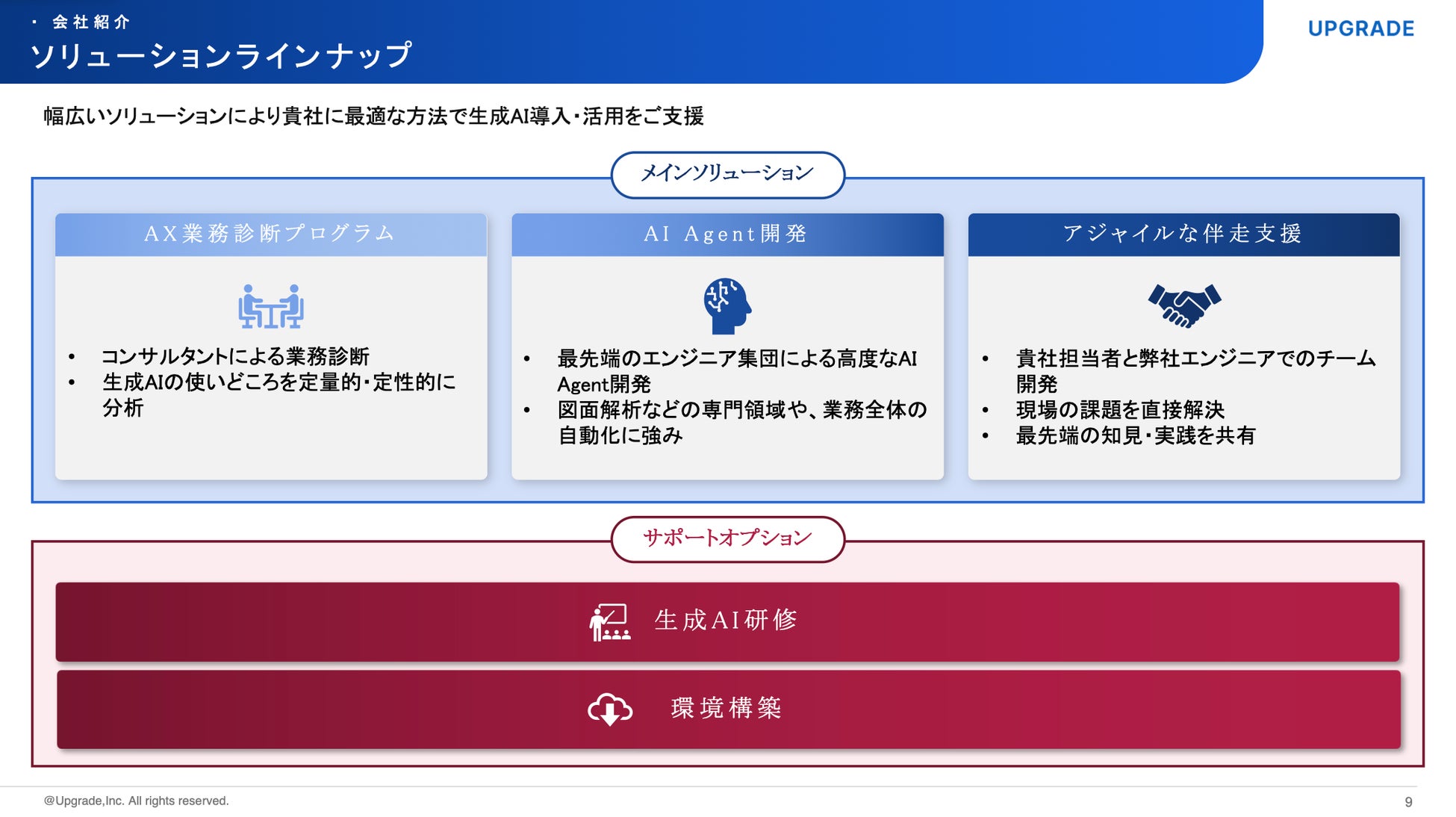 株式会社アップグレードは、「労働生産性革命」をミッションとし、生成AIソリューション事業およびリスキリング事業を提供しています。生成AIソリューション事業では、お客様の業務課題分析から生成AIを活用したシステムの企画・開発・導入、そして運用支援に至るまで、伴走型で一気通貫支援しております。