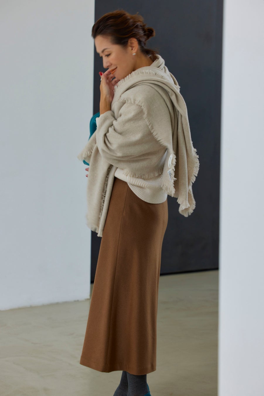 「カシミヤならではの、しなやかさや柔らかさは、ボトムスにしたときにも生きると思って作ってもらったスカート。フロントに切り替えを入れ、両サイドの生地をバイヤスで使うことで、足捌きの良さとサイドに流れるような動きのあるシルエットの両方を叶えました。ウールやシルクでは出せない、カシミヤ特有の落ち感やドレープ感、そして艶も美しく表現することができた自信作。靴やシーンを限定しないミモレ丈にもこだわりました」