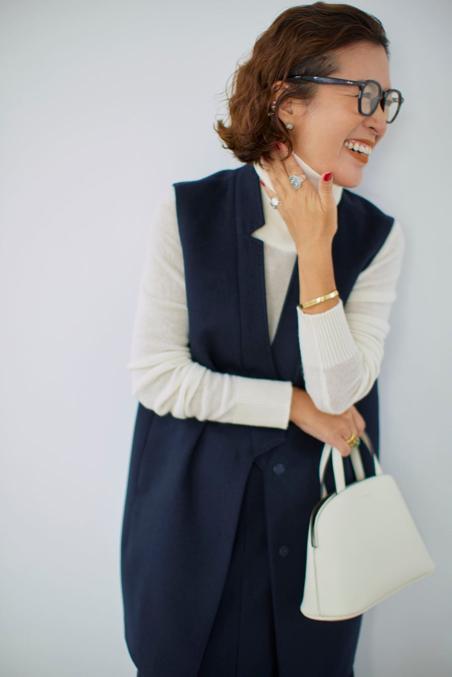 「カシミヤ100%の生地で仕立てられたジレを、あまり見たことがなくて。独特のテリとヌメリのある上質なカシミヤ生地で、きちんとしたジレを作りたいと思いました。マニッシュで立体的な襟に対して、シルエットは甘やかなコクーン。ジレならではのカジュアル感はありながら、長すぎず短すぎない着丈も相まって、きれいめ〜カジュアル、甘〜辛、パンツ〜スカートまで、様々なシーン・テイスト・ボトムスに馴染む一着が完成しました」