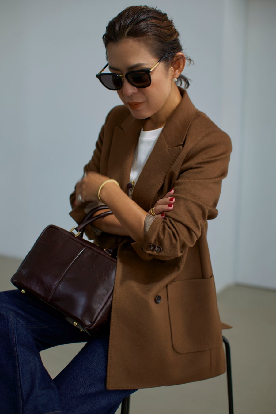 「贅沢を極めた一着。やや毛足のたった生地で仕立てているので、見ても着てもその優美さ、品質の高さを実感できます。さらに、カシミヤは、繊維が細くて柔らかく、ウールとはまた違ったしなやかさがあるので、かしこまり過ぎないのも◎。ベルトでウエストマークしたり、前のボタンを留めたり外したりという、着方の工夫もしやすいのです。肩にはあえてパットを入れ、丸みをおびた女性の身体を鋭角に見せると共に、モード感を足しました」