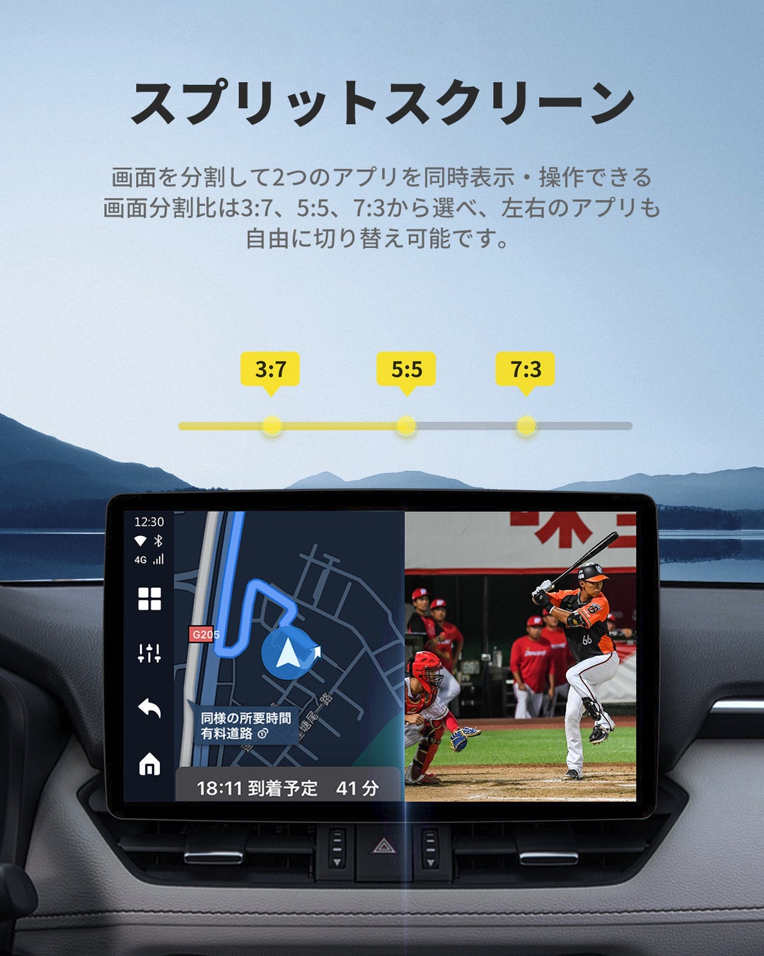 ナビゲーションと動画を同時に楽しめるスプリットスクリーン機能を搭載。画面は3:7、5:5、7:3の比率で柔軟に分割でき、左右のアプリも自由に切り替え可能です。たとえば、長距離ドライブ中でもGoogleマップを確認しながらYouTubeでお気に入りの動画を楽しめるので、退屈しがちな子どもたちも大喜び。運転中も安全に情報を把握できるため、ドライバーにとっても安心の設計です。快適かつ楽しいカーライフをサポートし、家族みんなでのドライブをさらに充実させます。