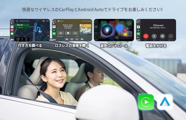 ワイヤレスCarPlayおよびAndroid Auto機能を搭載し、運転中の電話やメッセージ、音楽再生、地図案内、ポッドキャストなど、すべての有線CarPlay・Android Auto機能をワイヤレスで快適に利用できるアダプターです。