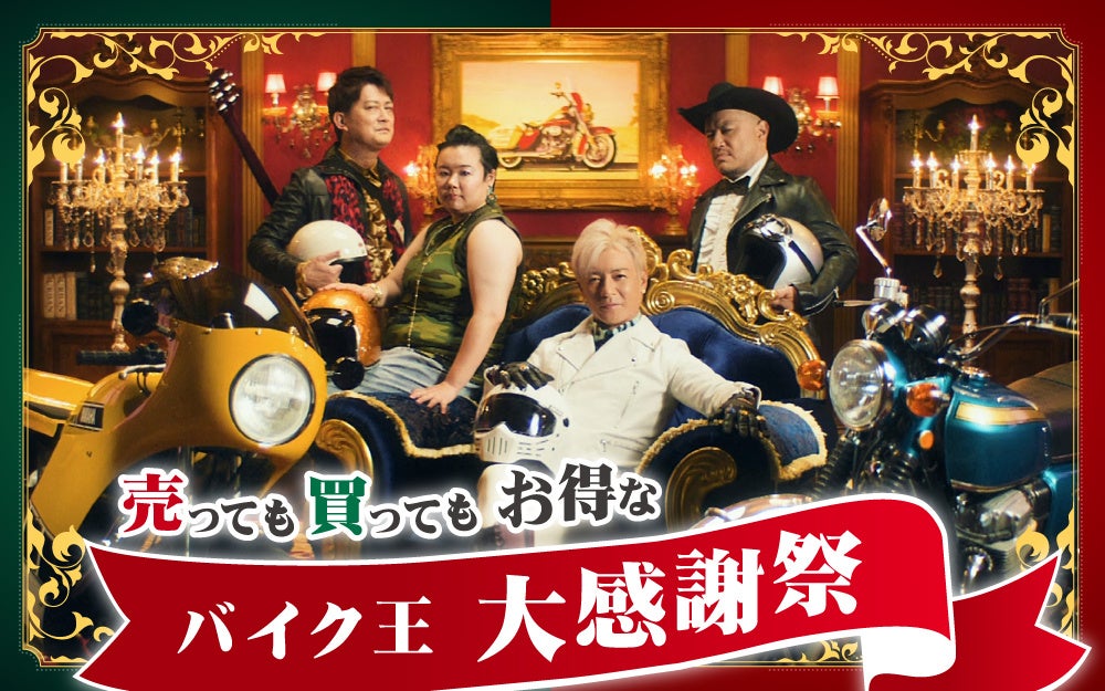 その中心には貴族のような存在感でつるのさんが堂々と歌い上げます。このキャンペーンソングを聞いて10万円当たるのは「オレでしょう!」と思ったバイカーの方はGO~♪バイク王♫