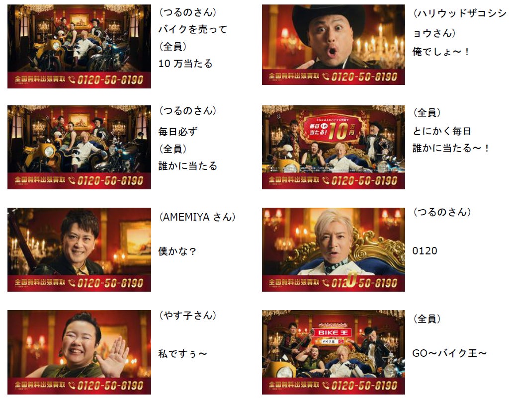 当キャンペーンは、売ってお得な「バイクご売却で毎日当たる!10万円」と、買ってお得な「バイクご購入でローン金利0円! 」の2本立てとなっており、本CMは売ってお得な「バイクご売却で毎日当たる!10万円」を表現した内容となっております。シャンデリアが輝くヨーロピアンでゴージャスな空間を舞台に、ライダー風の装いをしたつるの剛士さん、ハリウッドザコシショウさん、AMEMIYAさん、やす子さんが共演し、それぞれ決めポーズをしながら、ゴージャスなキャンペーンメッセージを伝えます。クールな表情にも注目です。