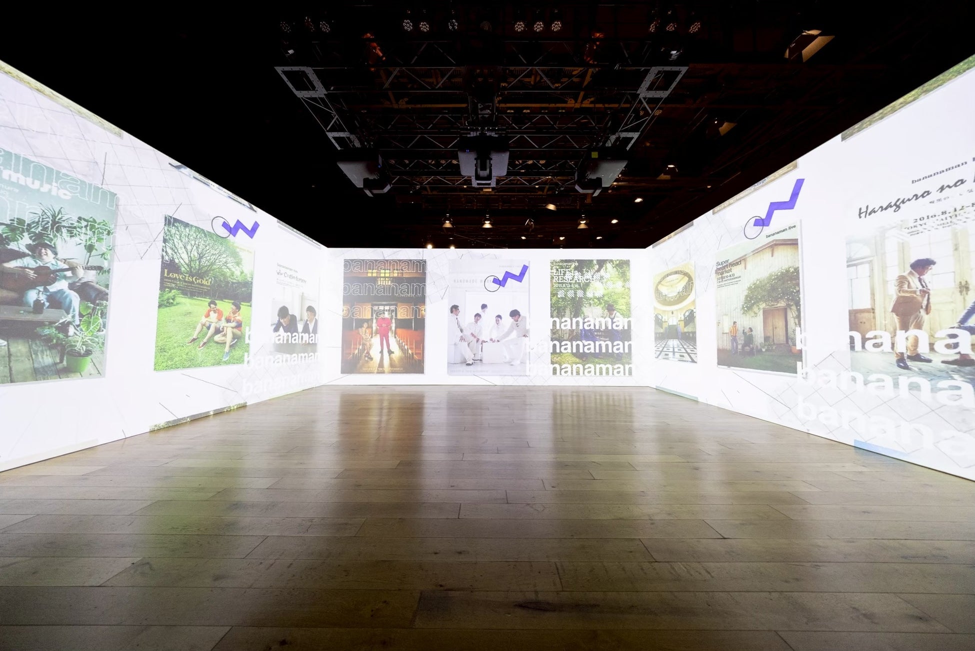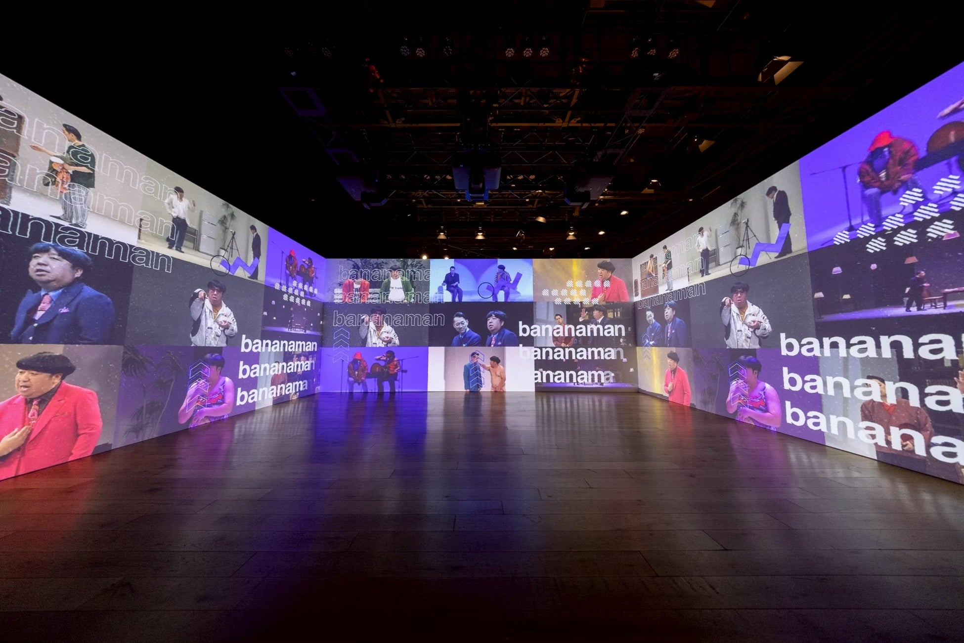 冒頭は、バナナマン POPUP STORE 2025にて販売されたグッズが宇宙空間を舞う3D映像でスタート。思わず身体が動いてしまうような没入映像で、イベントへの期待感を高めるような演出を。その後、過去映像が並んだ巨大空間や、懐かしい歴代フライヤーが出現しました。