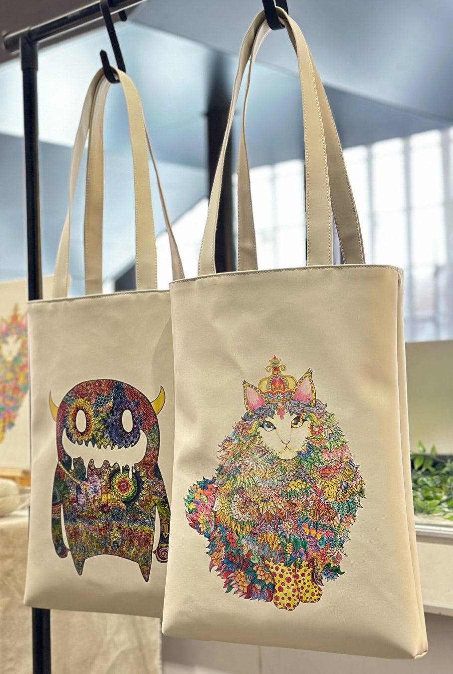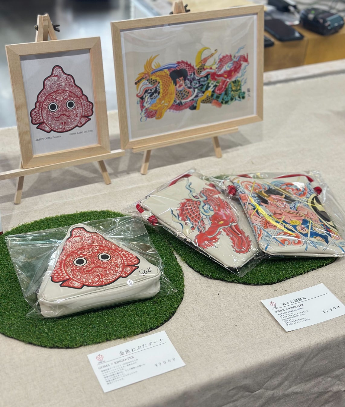 コラボ商品は、GOMA氏の代表的なデザイン「ムーンモンスター」「クラウンキャット」を、当社が開発・製造するりんご由来のバイオベースレザー「RINGO-TEX®︎(リンゴテックス)」に施したトートバッグ(2デザイン・数量限定)です。また、同素材を青森県十和田市の木製サッシメーカー・株式会社日本の窓の端材と組み合わせた新商品「アートパネル」のプロトタイプも先行展示いたします。トートバッグの縫製は、青森県八戸市の就労継続支援事業所「八戸グリーンプランツ」(運営:非営利型一般社団法人禾倫)が担当しており、福祉就労を通じたものづくりを実現しています。あわせて、昨年のねぶた祭期間中に好評を博した当社オリジナルのねぶたコラボ商品も再販いたします。