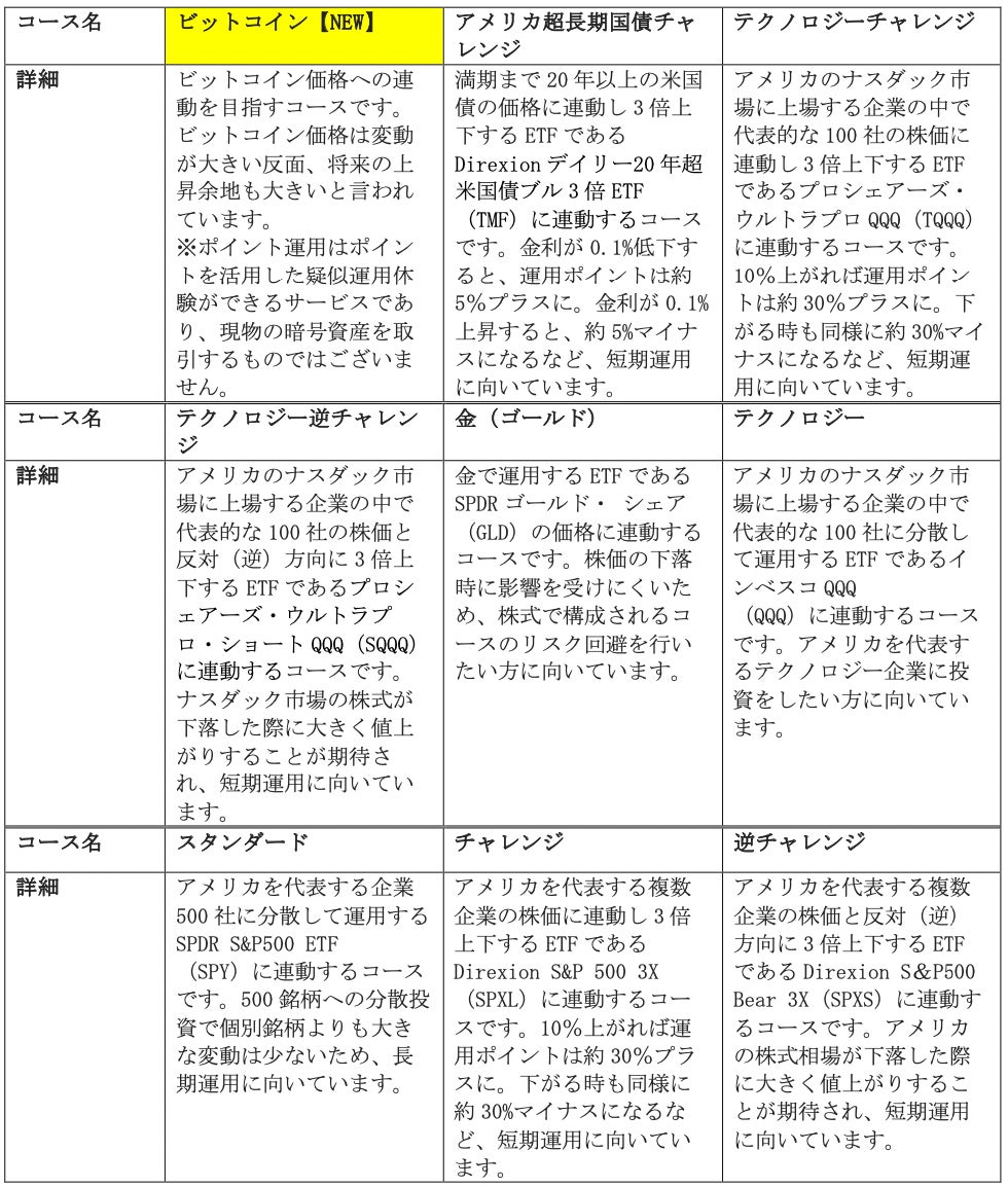 現在、「ポイント運用」では「スタンダードコース」「チャレンジコース」「テクノロジーコース」「金(ゴールド)コース」「逆チャレンジコース」「テクノロジーチャレンジコース」「テクノロジー逆チャレンジコース」「アメリカ超長期国債チャレンジコース」の8コースを提供しています。今回、新たに1コースが加わり、人気度やテーマ性、リスク許容度を軸にした計9コースをご用意し、よりユーザーの運用スタイルや好みに合ったコースを選択できるようになります。