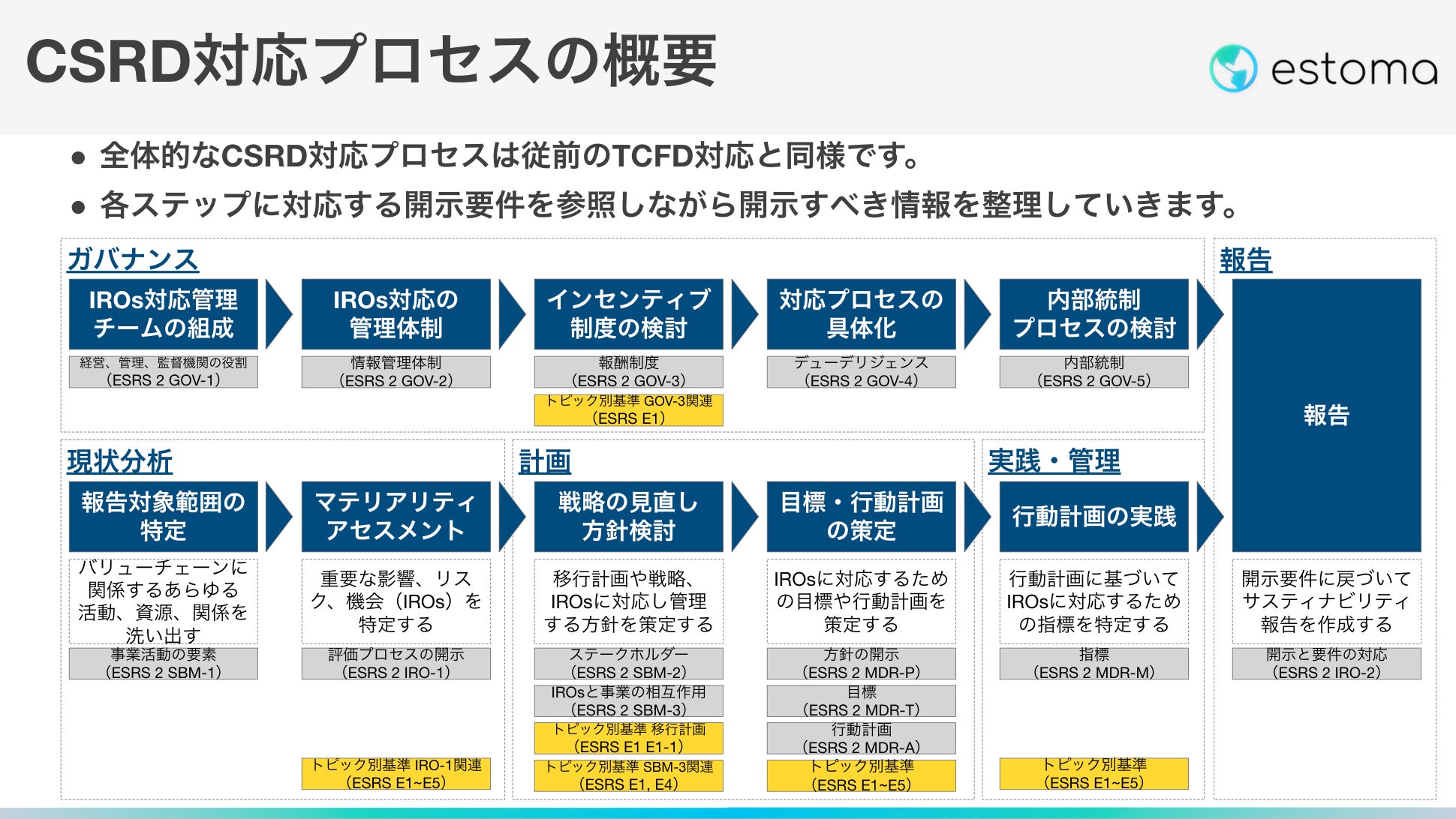 CSRD対応プロセスは、従前のサステナビリティ・レポートと大きな差はありません。マテリアリティを特定後、対応が必要な開示要件を洗い出し、報告書にまとめていきます。