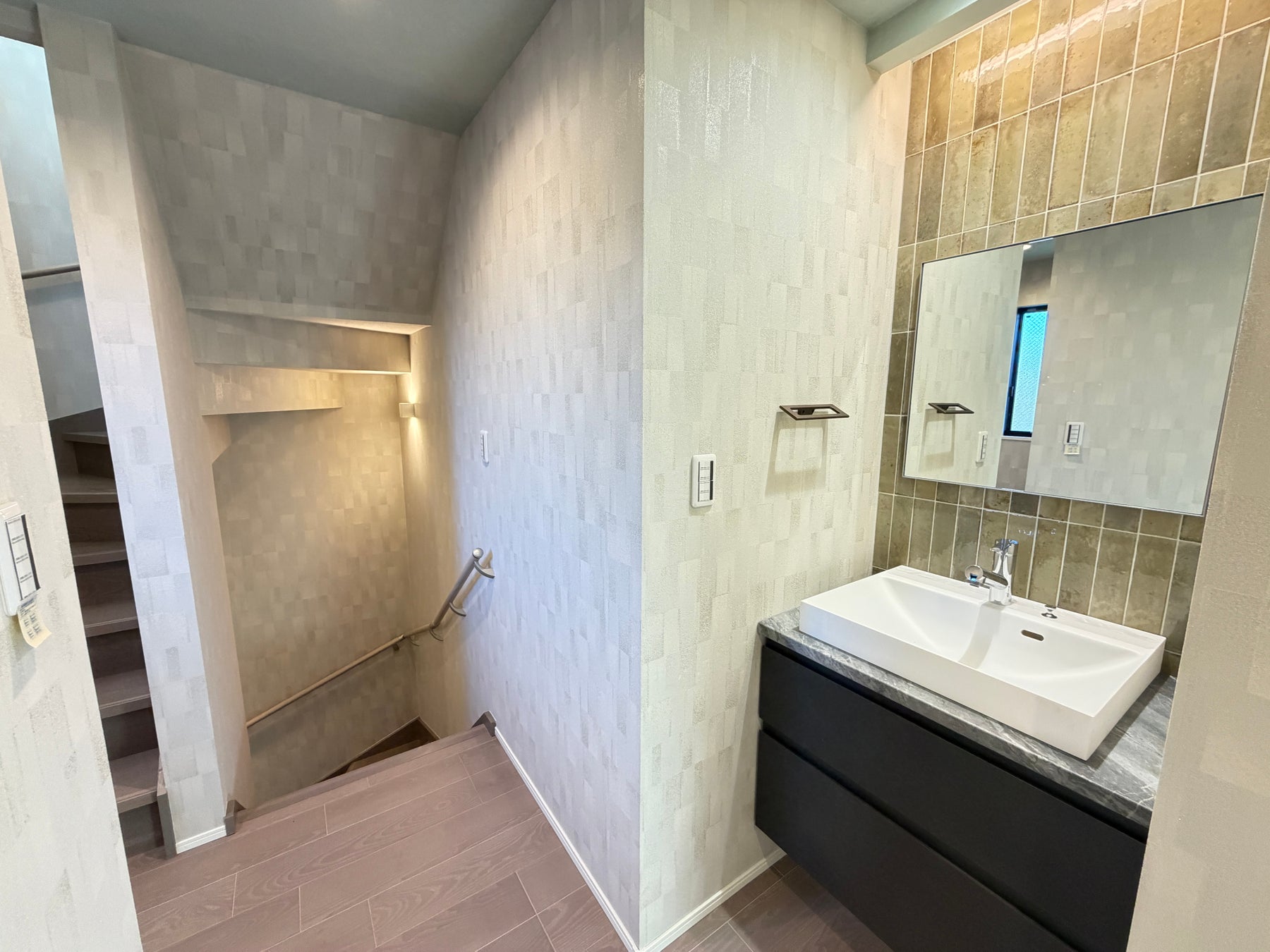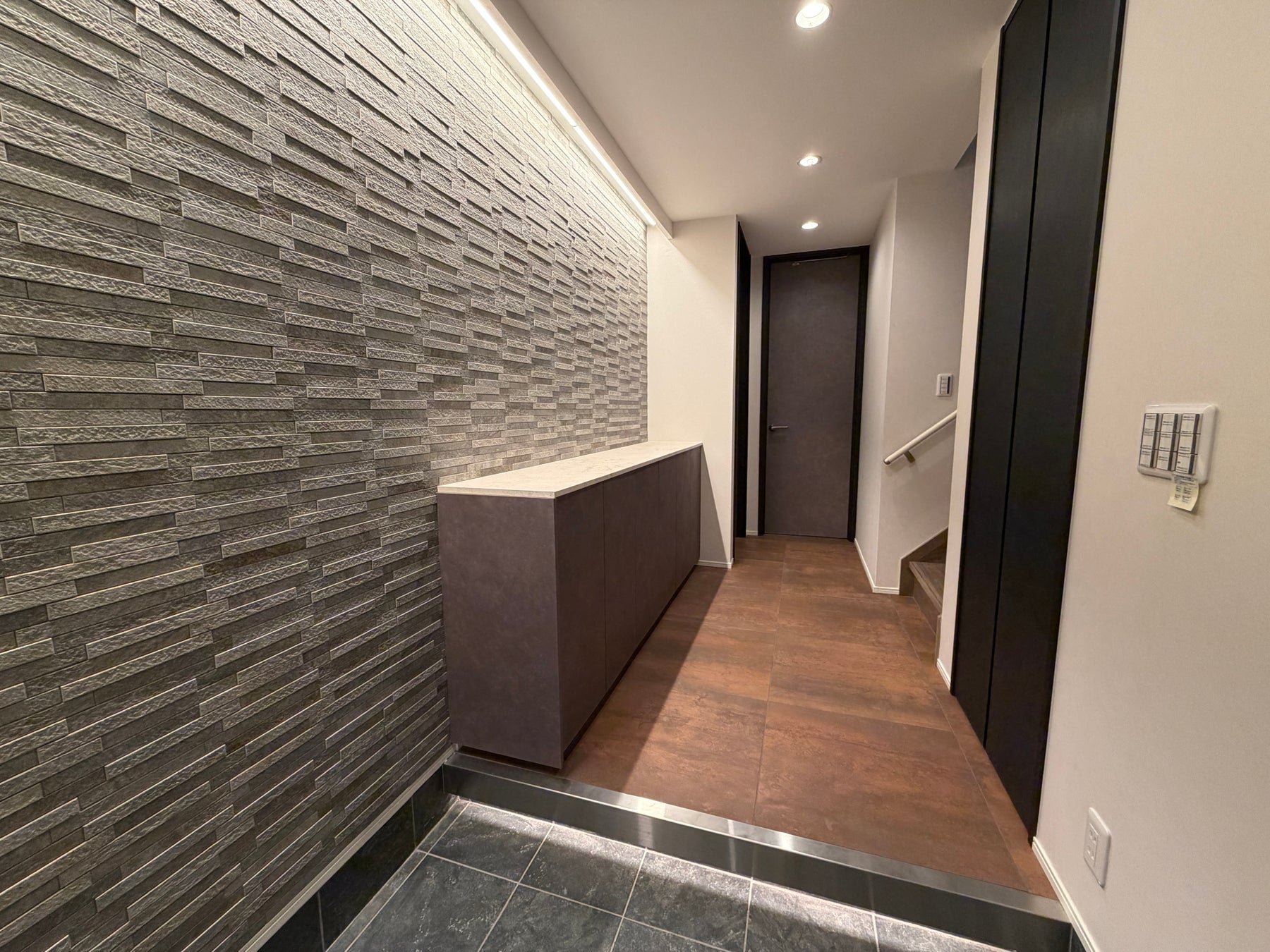 玄関には、天然石調のタイルを贅沢に採用。上品な質感が訪れる人を温かく迎えるとともに、風水の観点でも“良い気”を取り込むとされ、気の流れを整える上質な空間を演出し、明るく清潔な印象を生み出します。