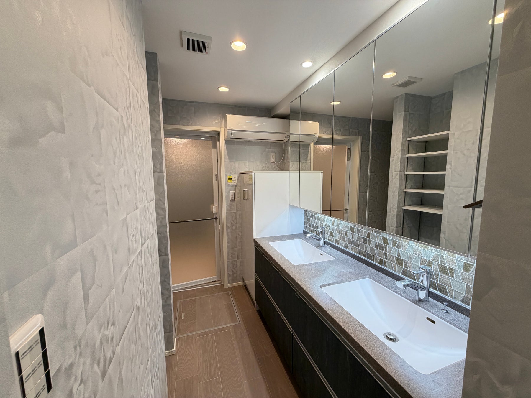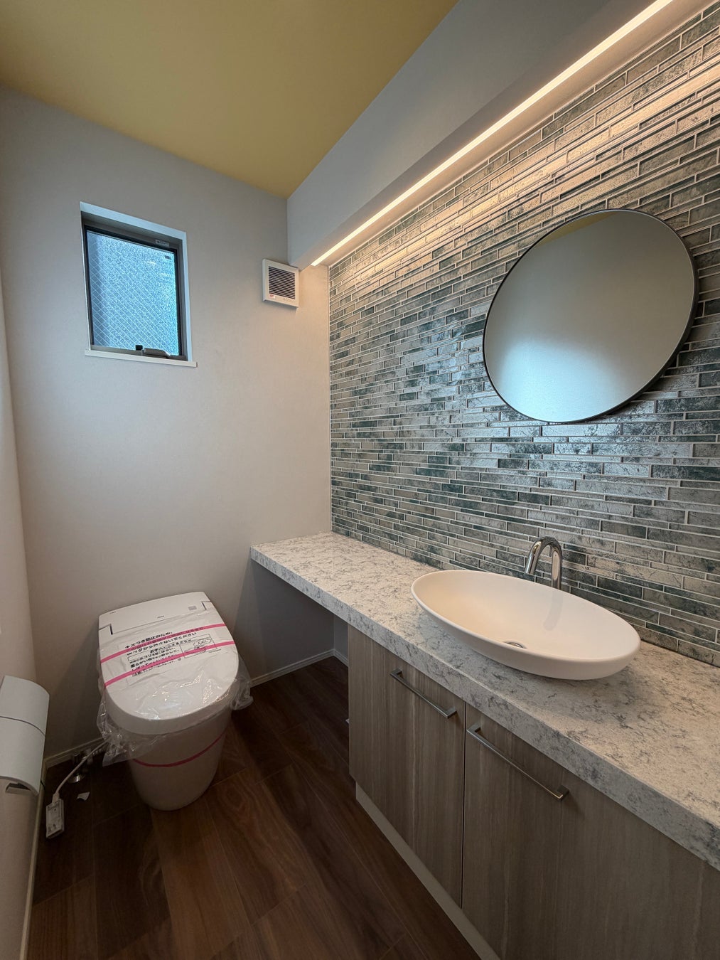洗面台やお手洗いの壁面にガラスタイルを贅沢に使用し、デザイン性と存在感を高める仕立てとなっています。