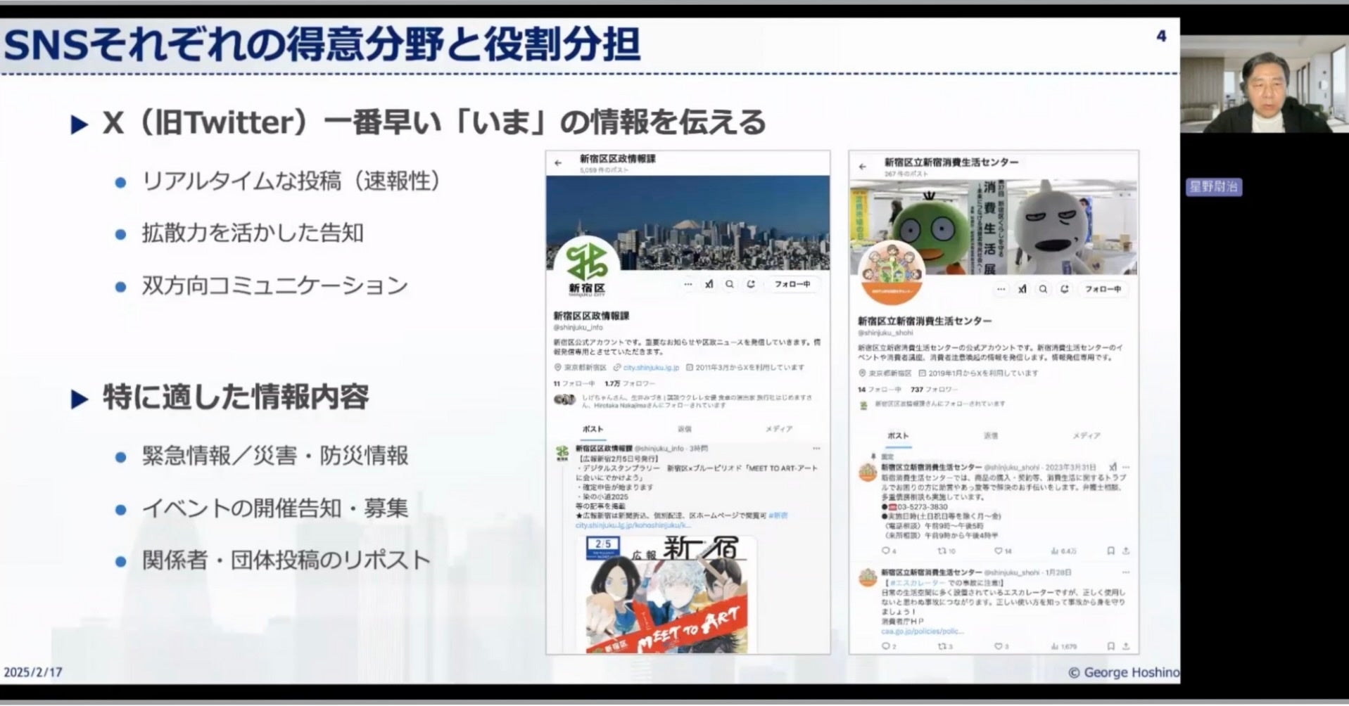 マーケティング教育・研修事業を行う当社 CMO の星野尉治(ほしの じょうじ)が、2025年2月17日(月) に収録のあった新宿区主催のセミナー「SNSで区民とつながる」に講師として登壇いたしました。本セミナーでは「SNSで新宿区の魅力をもっと伝えよう!」をゴールに、新宿区職員の皆様に向け、各SNSの特徴やそれぞれに適した情報の発信内容、SNS活用のコツ、新宿区SNSの将来的な可能性等についてご説明させていただきました。