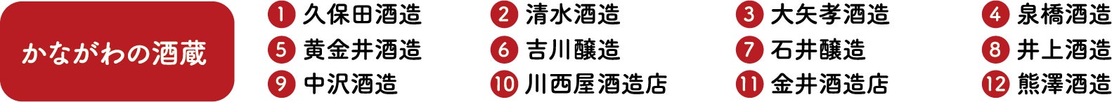 神奈川県内12蔵 (久保田酒造・清水酒造・大矢孝酒造・泉橋酒造・黄金井酒造・吉川酒造・石井醸造・井上酒造・中沢酒造・川西屋酒造店・金井酒造店・熊澤酒造店) |