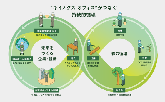 サステナブルなオフィス空間の構築を提供する当社のオフィスパッケージ「エコワク」の理念とも親和性がとても高いと感じ、互いの思想が合致し業務提携に至りました。業務提携により、「キイノクス オフィス プロジェクト」が提供するオフィス家具等の代理販売の体制を整え、「エコワク」のオフィス構築のサービスラインナップを拡充し、積極的に国産木材を使用したオフィス家具等の提供を行ってまいります。キイノクスの家具を導入いただいた企業様には、植樹証明書や導入によるCO2貢献量が可視化できる証書を提出することが可能です。FRSは同プロジェクトに賛同し、運営の中心を担うGDIと業務提携を行うことにより、森林保全につながるサステナブルなオフィス空間構築の体制を強化、GDIを通じてプロジェクトへも寄与・推進していきます。