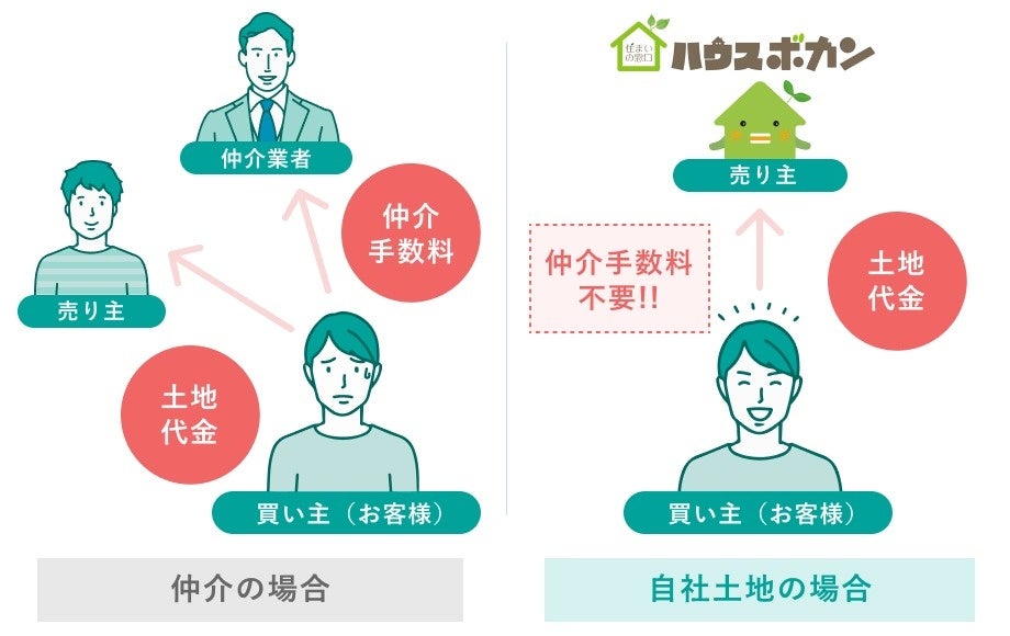 通常、不動産会社を通じて土地を購入する際には、土地費用の他に仲介会社に支払う仲介手数料が必要となります。「ハウスボカン」では自社で仕入れて販売を行っているため、自社売主の土地に関しては仲介手数料がかからず家づくりのコストを抑えることが可能です。