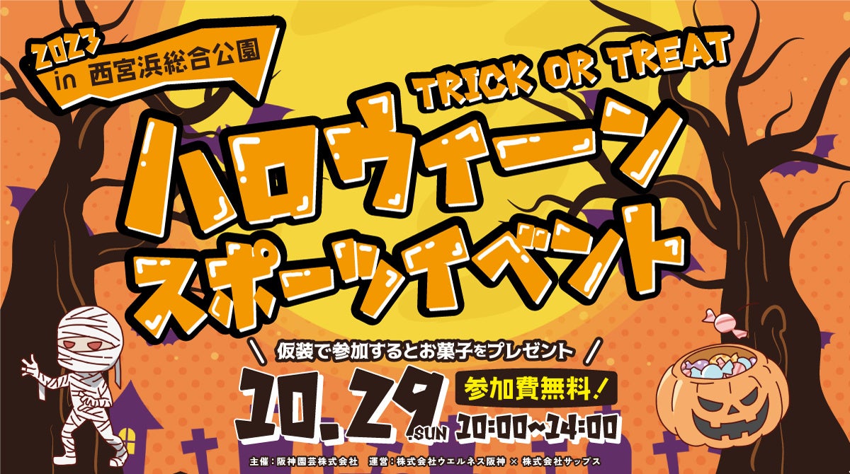 株式会社ウエルネス阪神(所在地:兵庫県⻄宮市、代表取締役社⻑:岡本 直樹)と株式会社サップス(本社:兵庫県⻄宮市、代表:中瀨 敏和)は、地域の皆様にスポーツを楽しんでもらおうと阪神園芸株式会社(所在地:兵庫県⻄宮市、代表取締役社⻑:久保⽥ 晃司)が指定管理を担う⻄宮浜総合公園で10⽉29⽇(⽇)にハロウィーンスポーツイベントを開催します。テーマはハロウィーン。ハロウィーンの仮装で参加するとお菓子がもらえるプログラムもあります。仮装はワンポイントでもOK。家族や友⼈と、ぜひお気軽にご参加ください。スポーツ✕ハロウィーンで、秋の1日を皆で盛り上がりましょう。