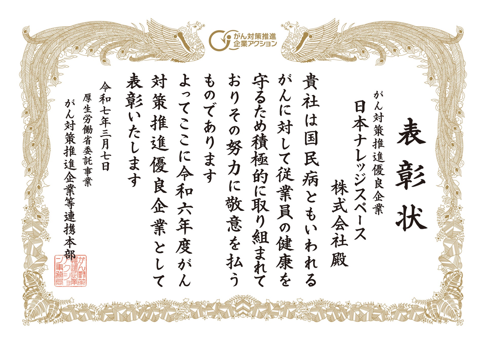 日本ナレッジスペース株式会社、4年連続で厚生労働省「がん対策推進優良企業」に表彰