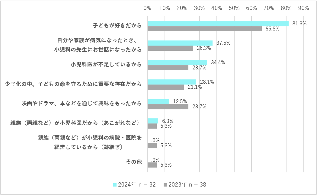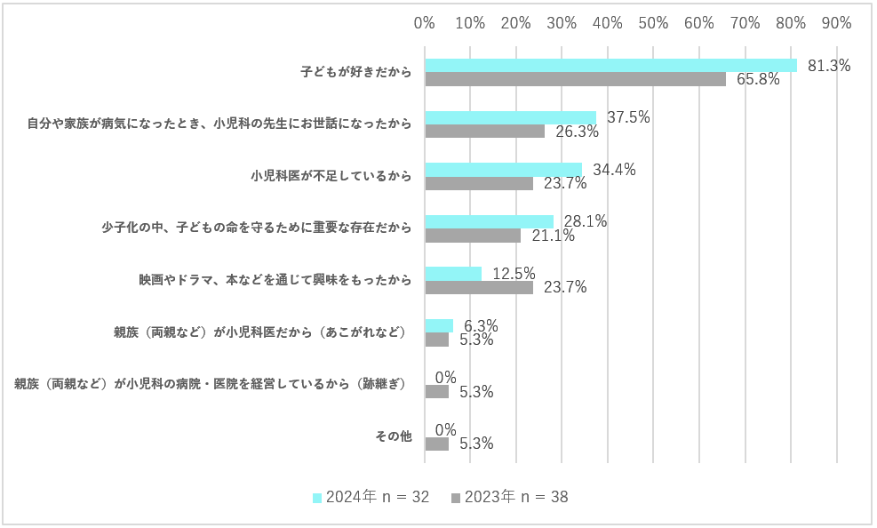「子どもが好きだから」が最も多く、8割強(81.3%)となった。次いで「小児科医にお世話になったから」(37.5%)、「小児科医が不足しているから」(34.4%)の順になり、いずれも前年調査より回答者の割合が増加した。