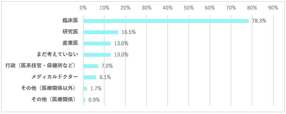 「臨床医」の回答が圧倒的に多く、8割近く(78.3%)の回答となった。2位は「研究医」(16.5%)となった。3位は同率で「産業医」(13.0%)と「まだ考えていない」(13.0%)となった。
