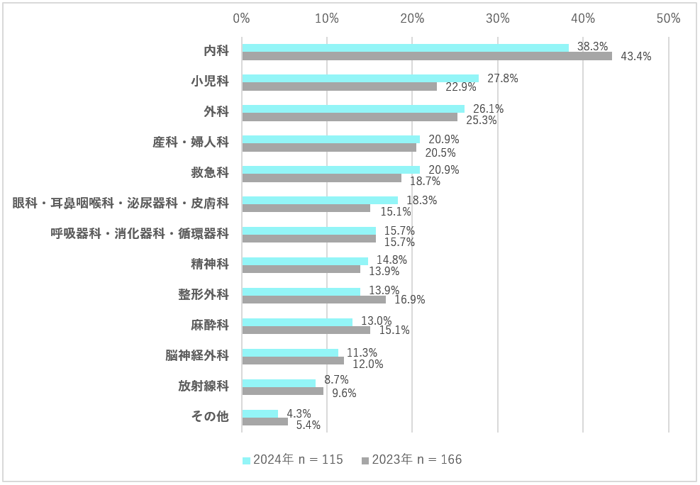 前年調査と比較し「内科」5.1pt減、「小児科」4.9pt増、「外科」0.8pt増となり、1位に変動はなかったが、前年2位だった「外科」を「小児科」が僅差(1.7%)で上回り、順位が逆転した。