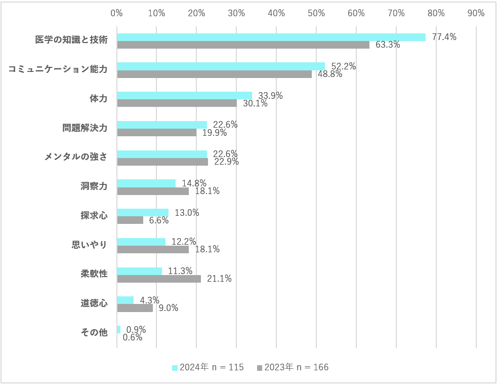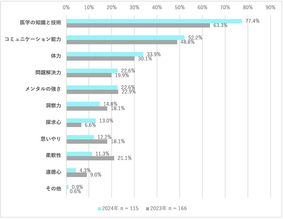 1位「医学の知識と技術」(77.4%)、2位「コミュニケーション能力」(52.2%)、3位「体力」(33.9%)の順となり、いずれの項目も前年調査と比べ増加した。