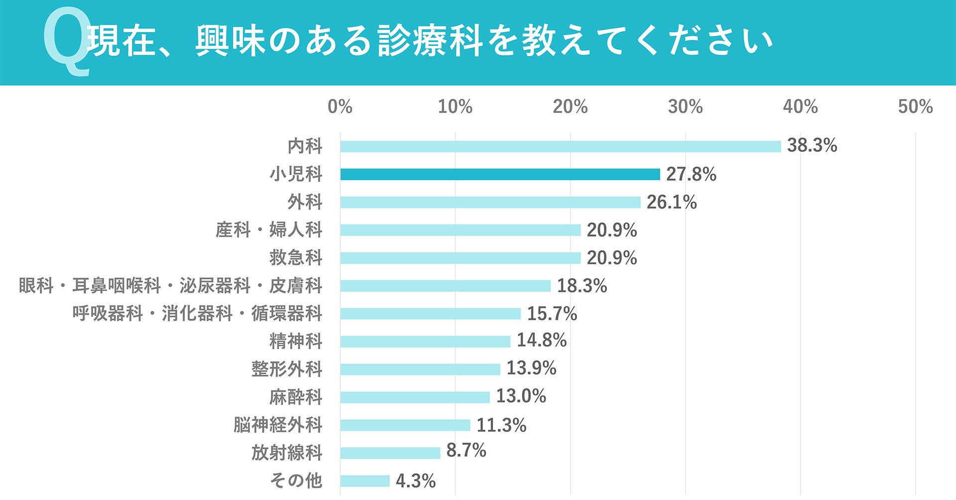 【アンケート結果】第2回 医学生の意識調査 興味のある診療科「小児科」が2位、前年3位からアップ 理由は「子どもが好きだから」が圧倒的に多く8割以上に