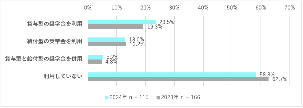 医学生の約6割(58.3%)が奨学金制度を「利用していない」と回答した。前年と比較し「奨学金を利用(貸与型・給付型・貸与型と給付型を併用)」(41.7%)している医学生が増加した。なかでも「貸与型の奨学金を利用」(23.5%)が最も多く4.2pt増加した。