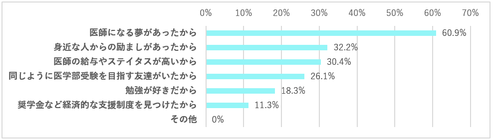 1位は「医師になる夢があったから」となり約6割(60.9%)が回答した。続いて2位「身近な人からの励ましがあったから」(32.2%)、3位「医師の給与やステイタスが高いから」(30.4%)となった。1位「医師になる夢があったから」は2位の「身近な人からの励ましがあったから」の約2倍となり大きく引き離した。