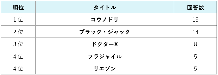 ●医学生の好きな医療系の漫画・アニメは、1位「コウノドリ」(15票)、2位「ブラック・ジャック」(14票)、3位「ドクターX」(8票)となった。(Q4)